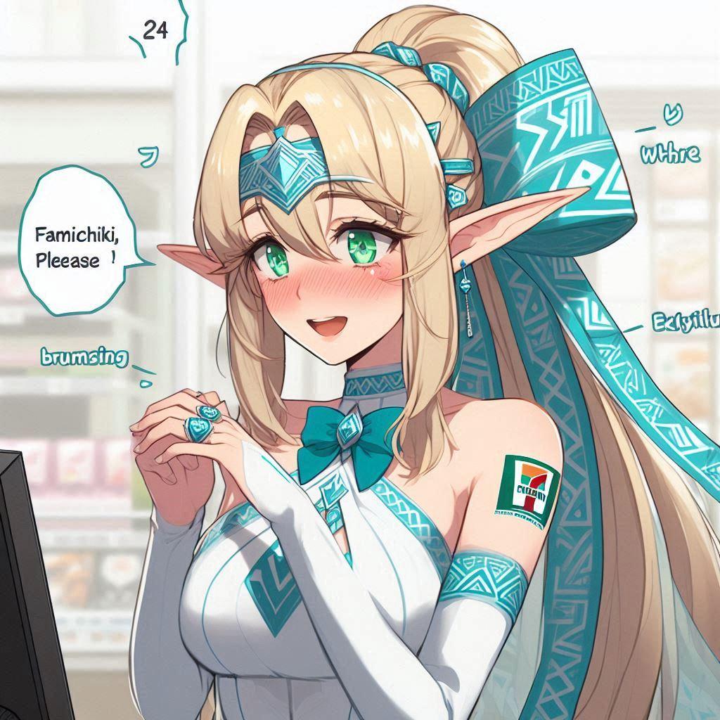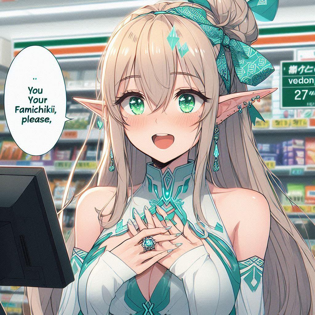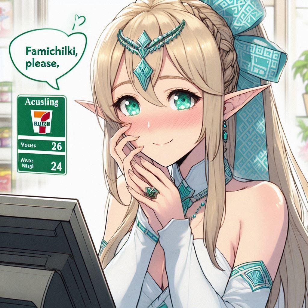 エルフの若奥様が(ファミチキ)を(セブンイレブン)で(注文)します。