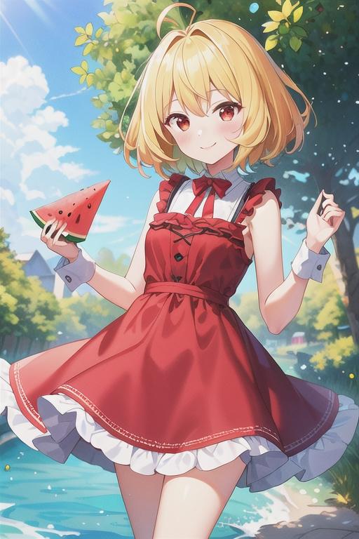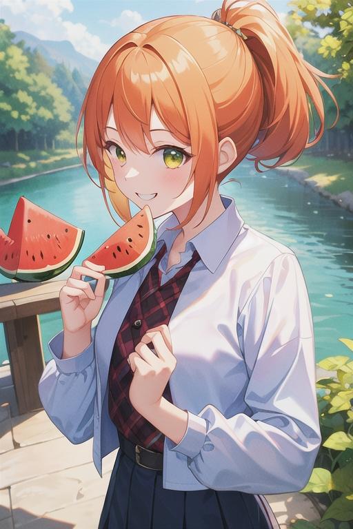元気になったナツミの快気祝いに川でスイカを食べる、3人。