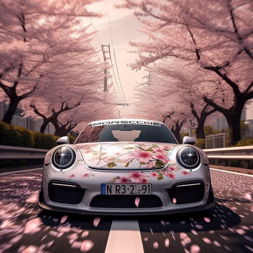 COPILOTで「桜が舞い散る道を疾走するポルシェをえがいてください」