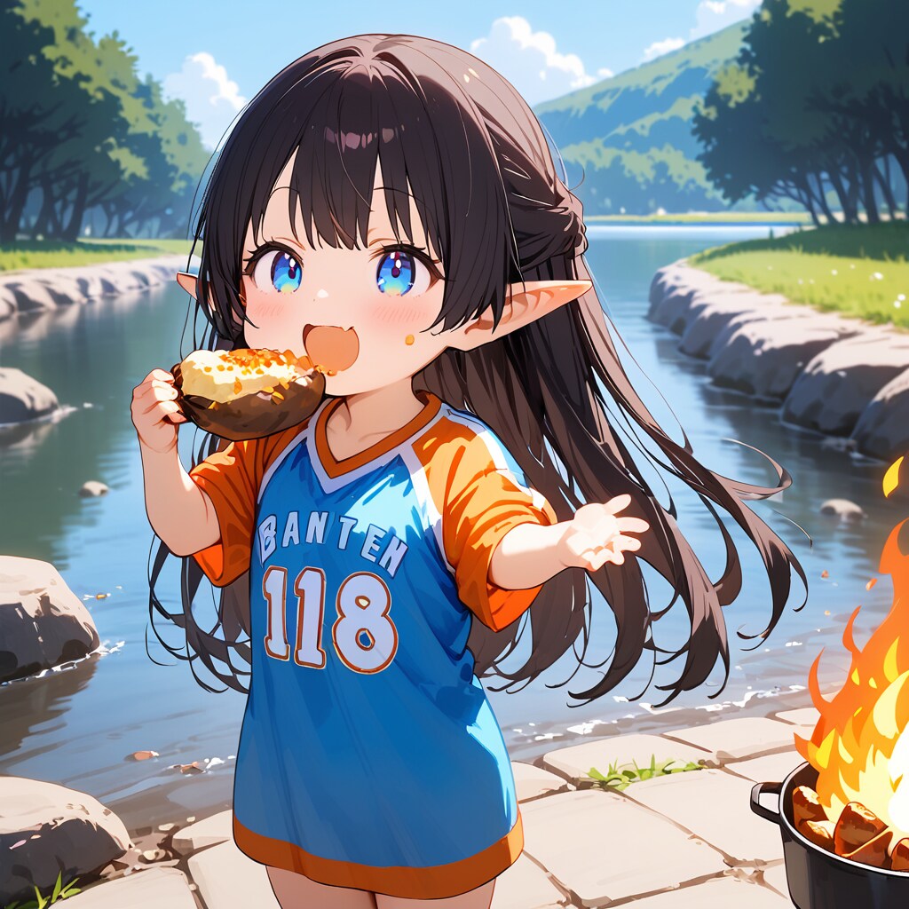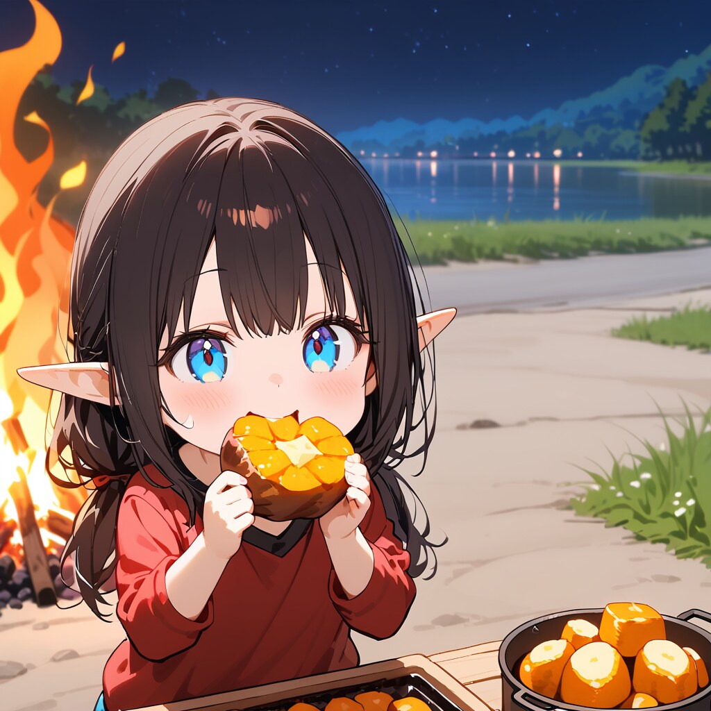 河原でお芋を焼いたエルフの小さな女の子