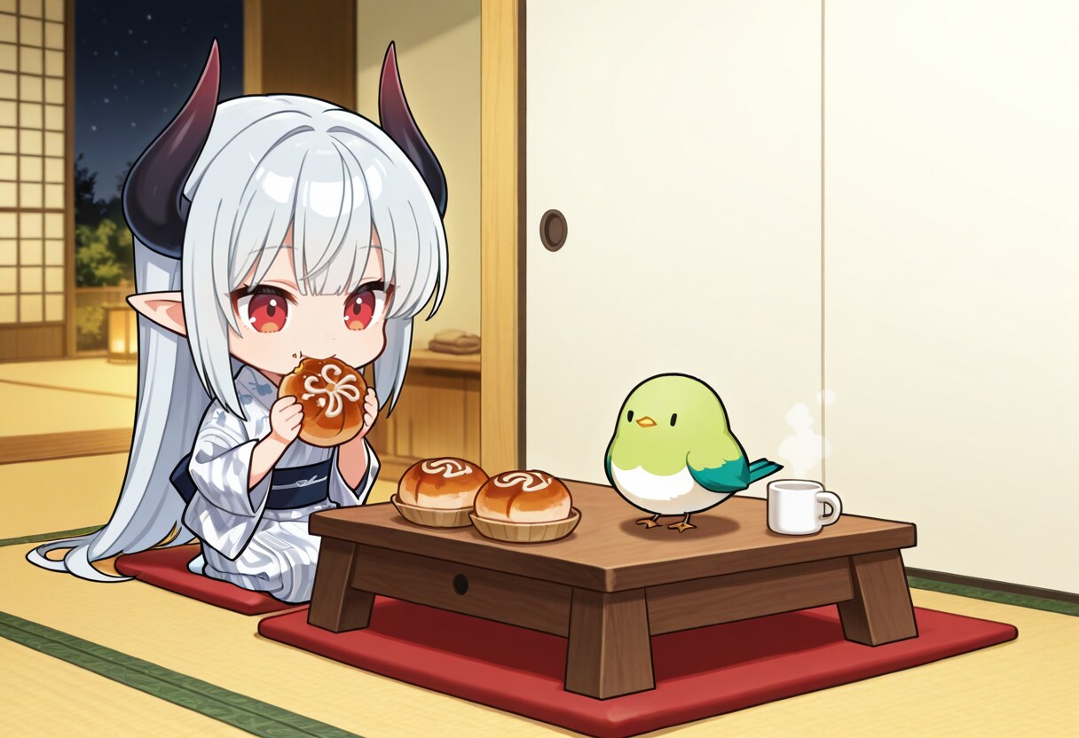 ↑こちらの、えすてぃさんのところの、喋るインコさんの温泉宿にお誘い頂きまして、実は甘味が好きな、いつもの銀髪竜姫さんに休日に満喫して貰いました。