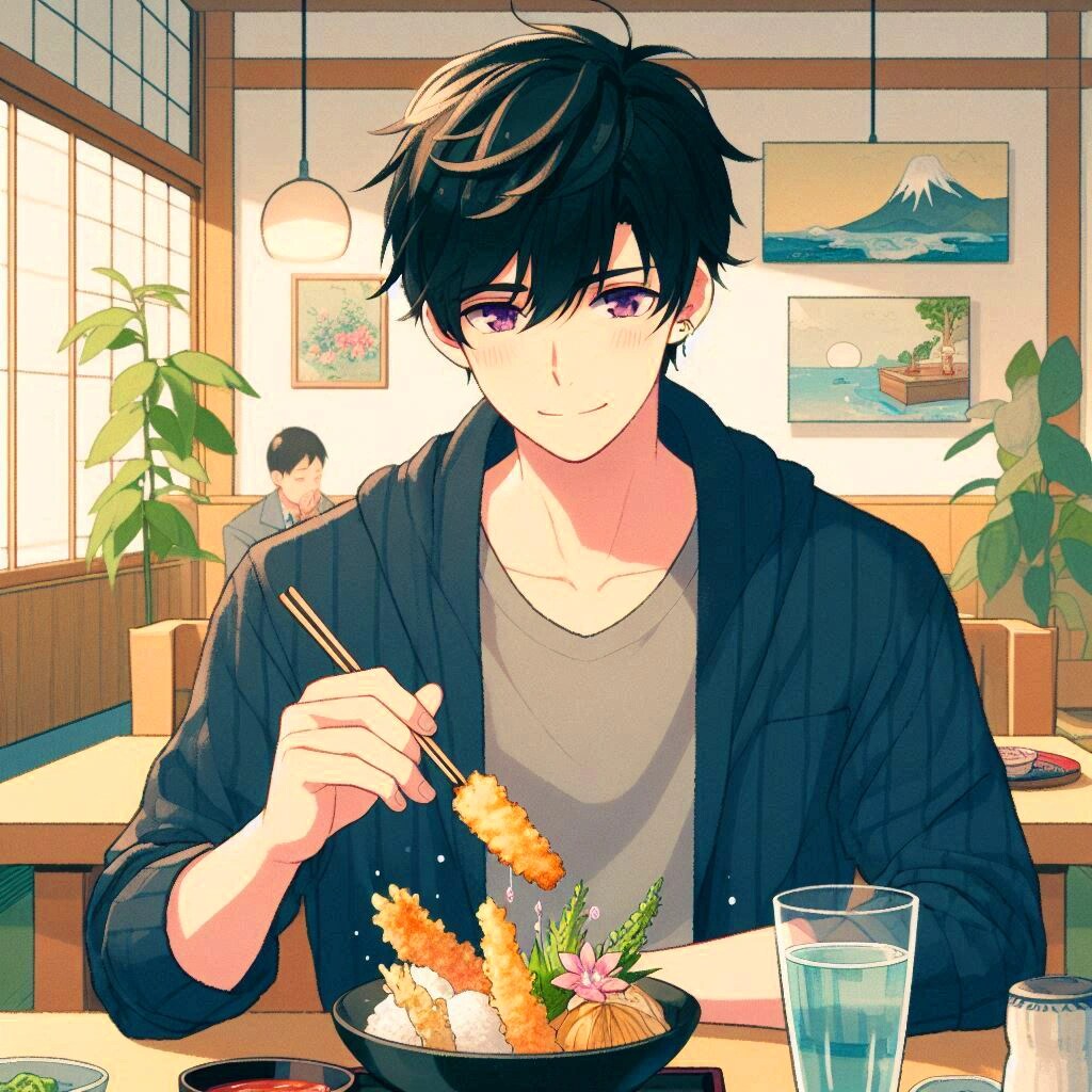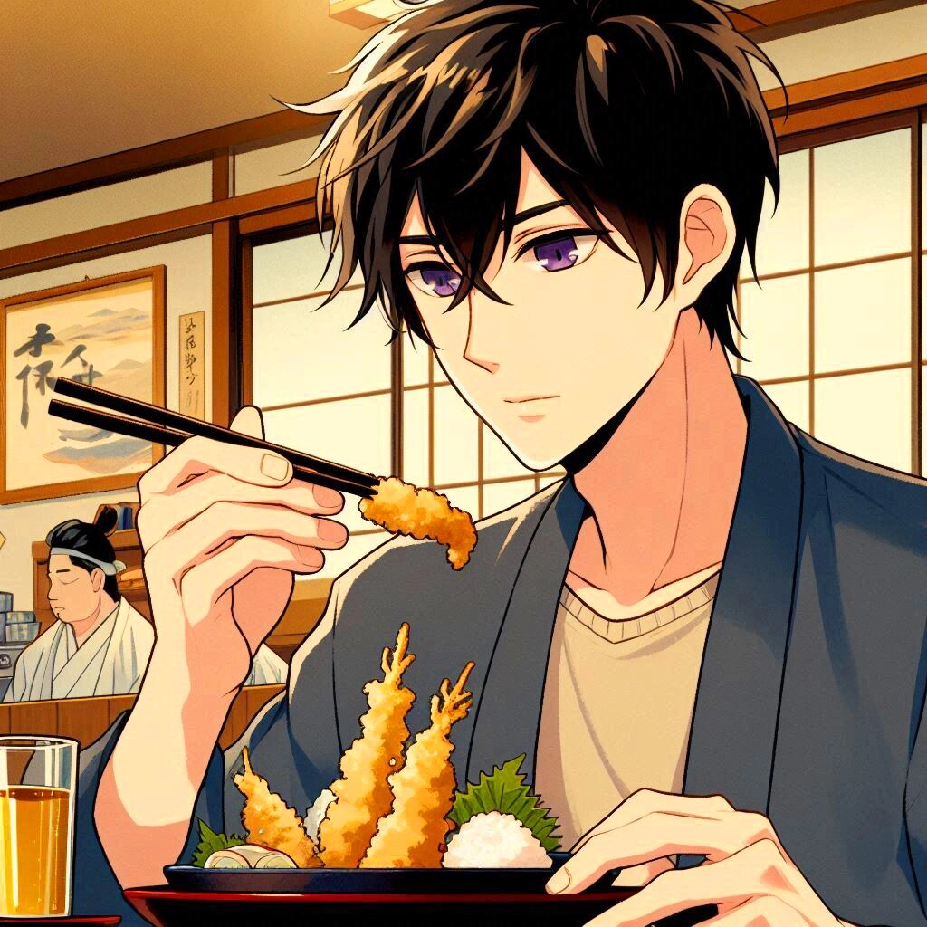 では、天ぷらと普段着な黒髪短髪男性をご覧くださいー。