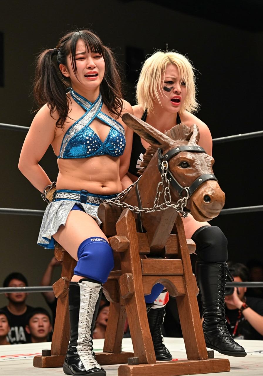 さらに両手を後ろで拘束されてしまい逃げる術はない!後ろから体を揺さぶられMIKURUは体験したことのないマ〇コへの激痛に涎が止まらない! ヒール「そんなに涎垂らして、本当は気持ちいいんじゃねぇのかぁ?