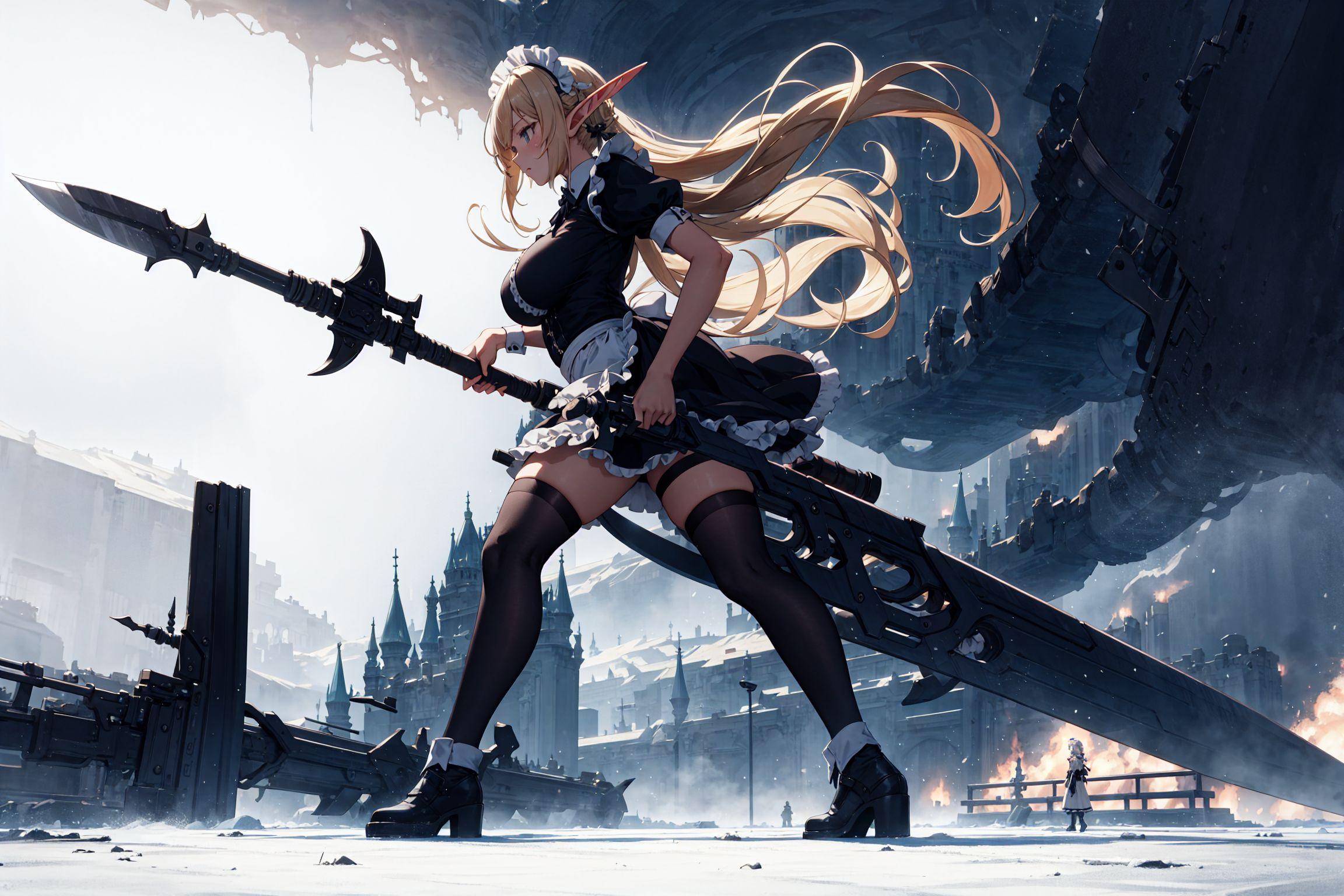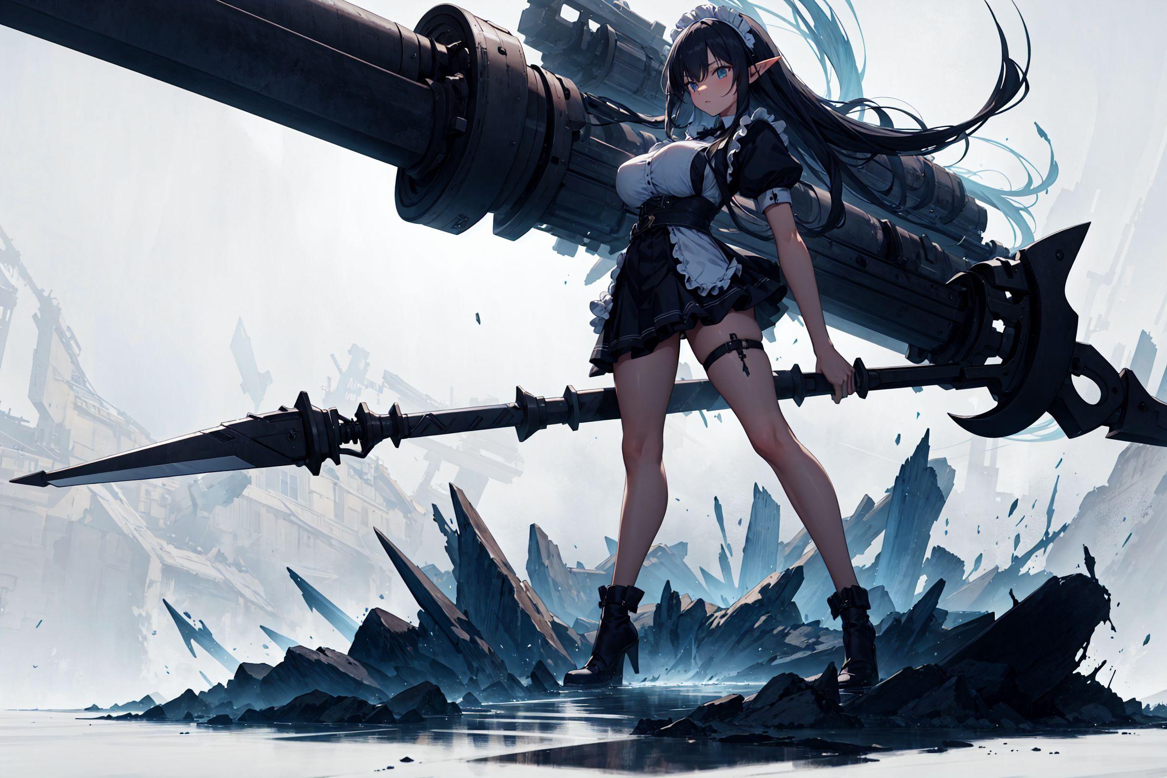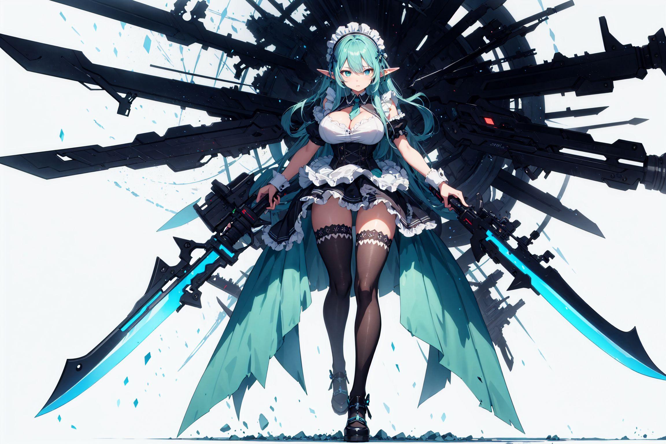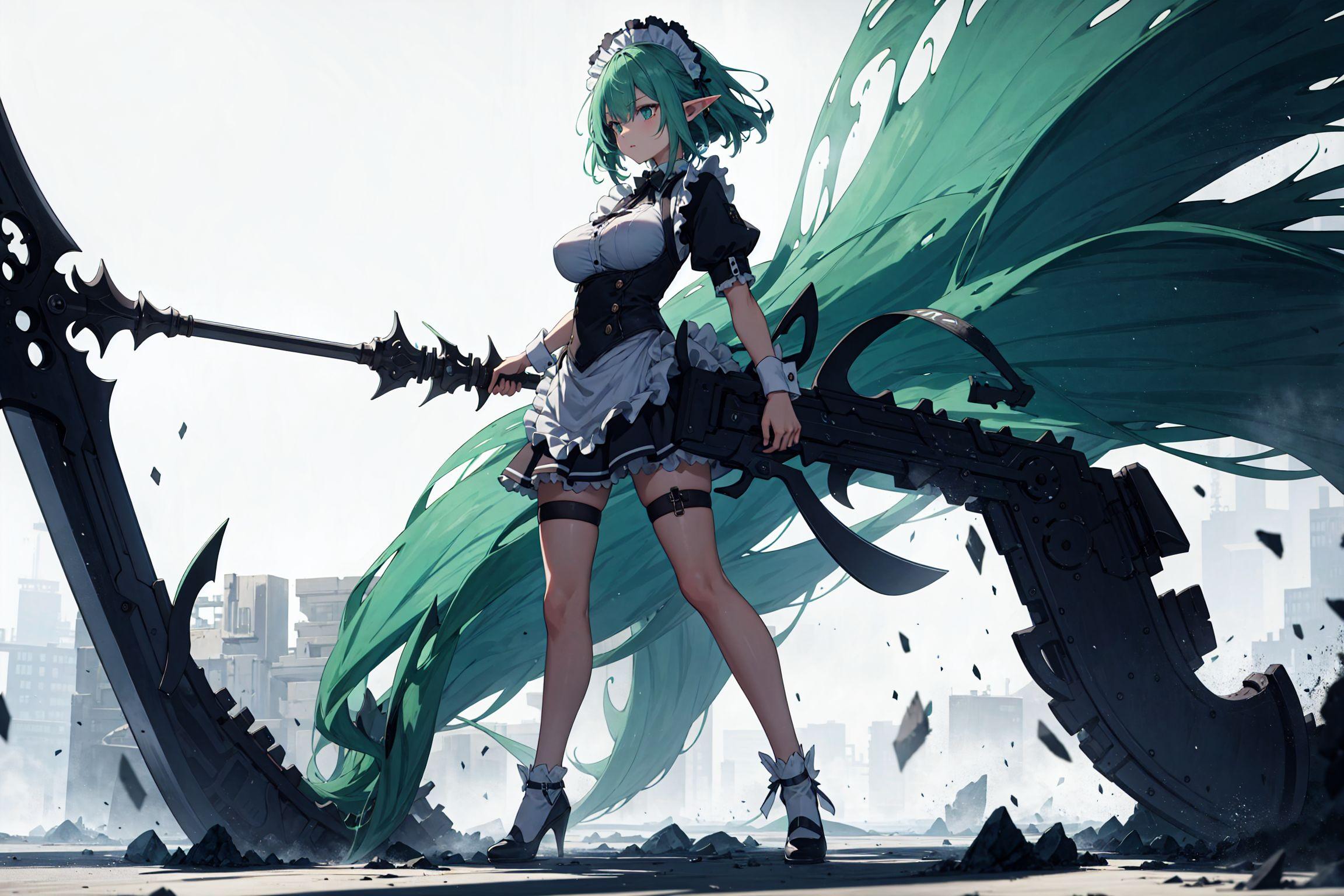 Steps: 25, Sampler: DPM++ 2M SDE Karras, CFG scale: 7.5, Seed: 1115873022, Size: 768x512, Model hash: 35b1f8b825, Model: ad2s, Denoising strength: 0.58, Clip skip: 2, Wildcard prompt: "hi res, heaven in maids, wielding (massive and (gigantic) 'WEAPON') her own size,\n(deformed), (aged down:1.3), large breast, cute elf girl, (looking away), (looking at another), detailed face, \natmospheric perspective, maid uniform, __expression__, __hairc__, __hairs__, white background, solo, holding weapon,\nnice hands, perfect hands,full body, pose,\n<lora:Silicon-landscape-isolation:1>", Hires upscale: 3, Hires upscaler: 4x_fatal_Anime_500000_G, Lora hashes: "Silicon-landscape-isolation: 6077cbf43340"