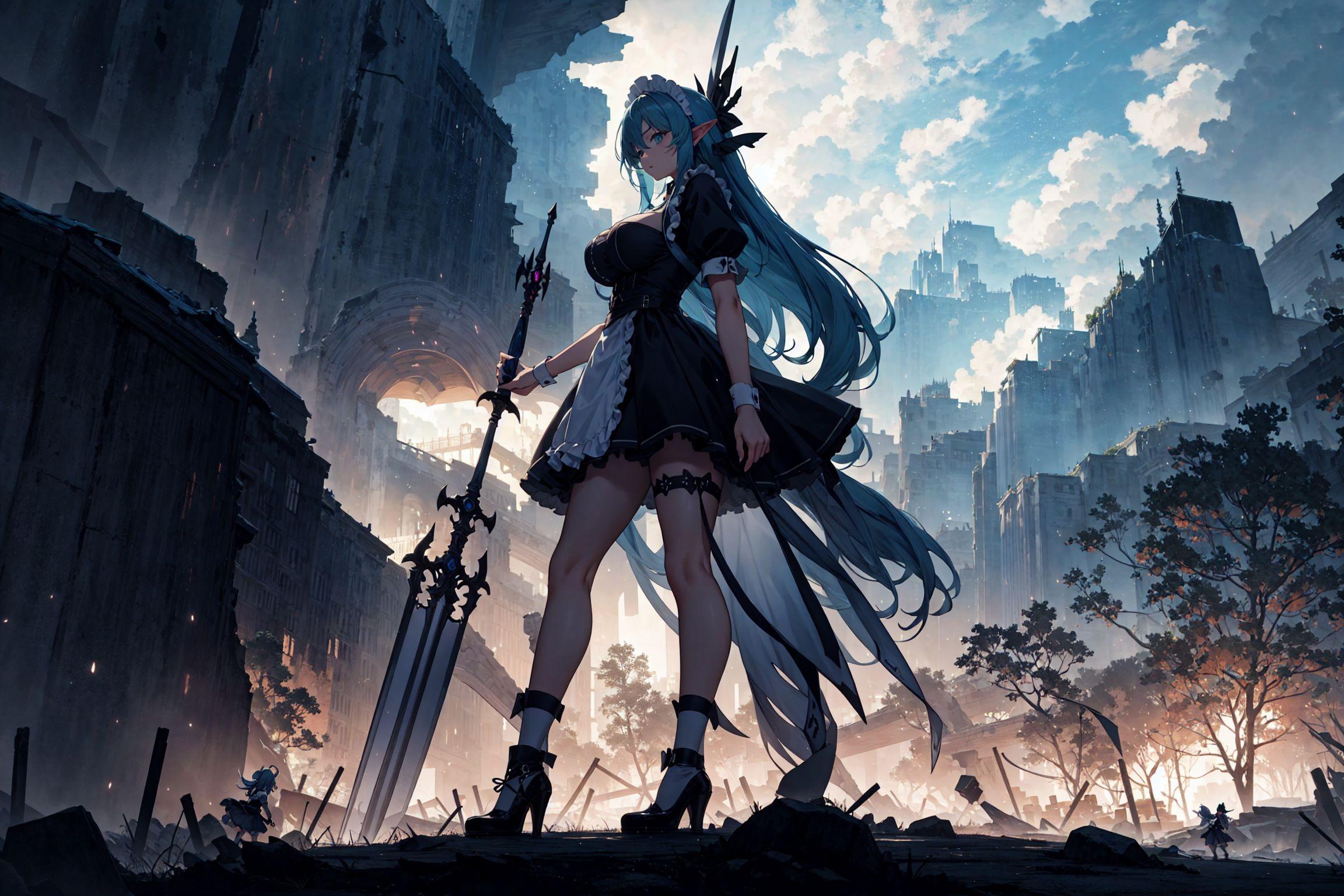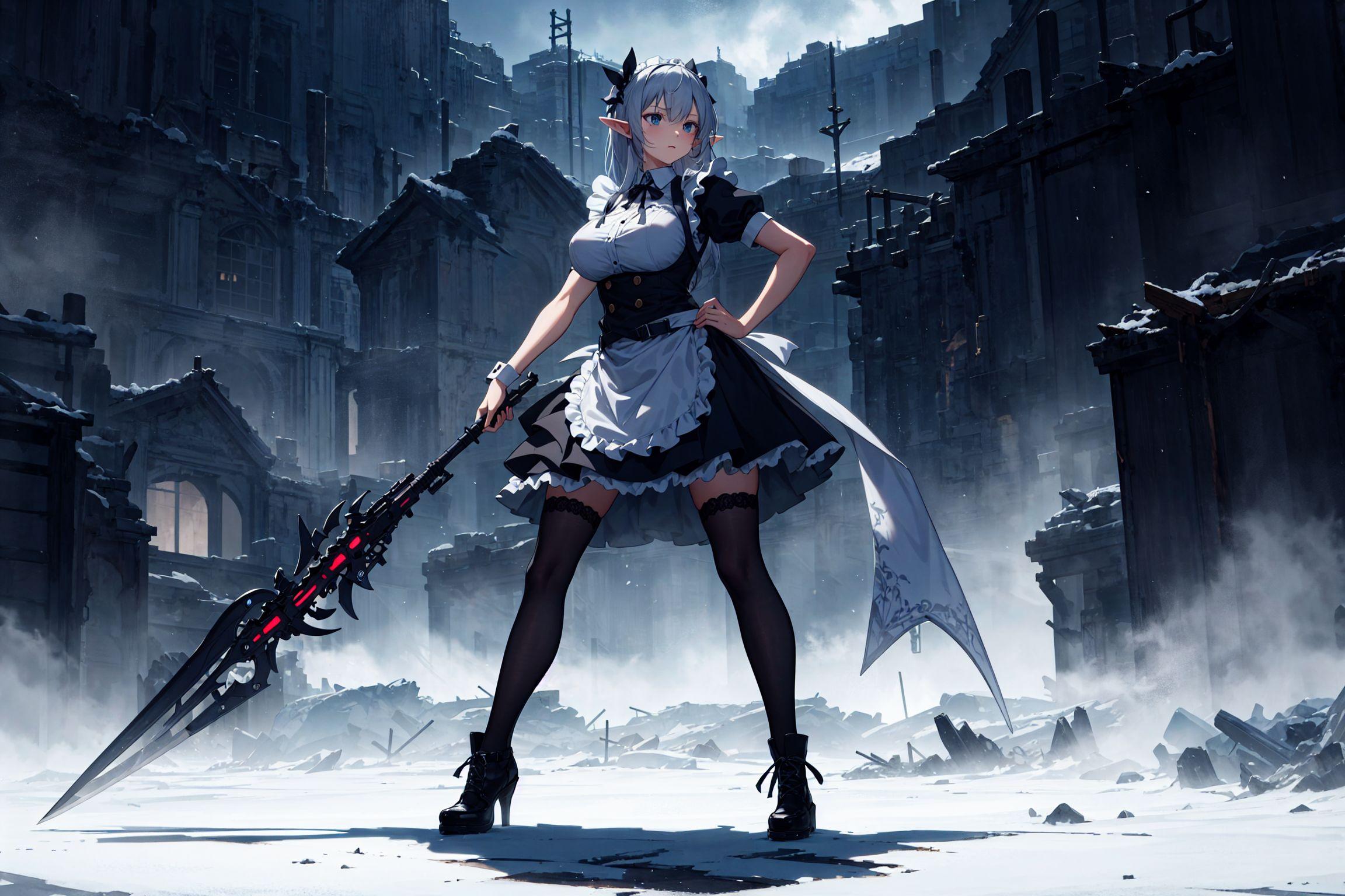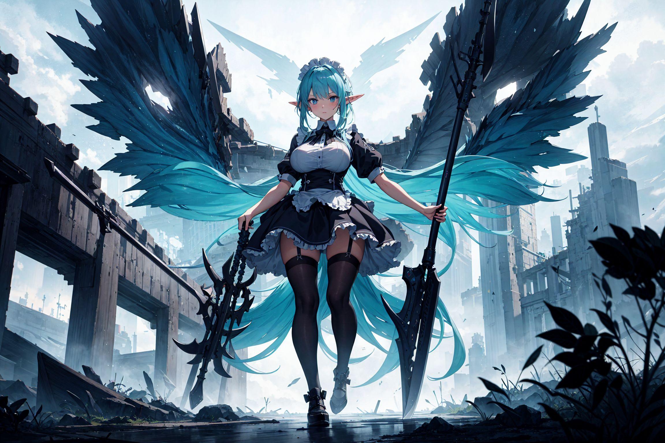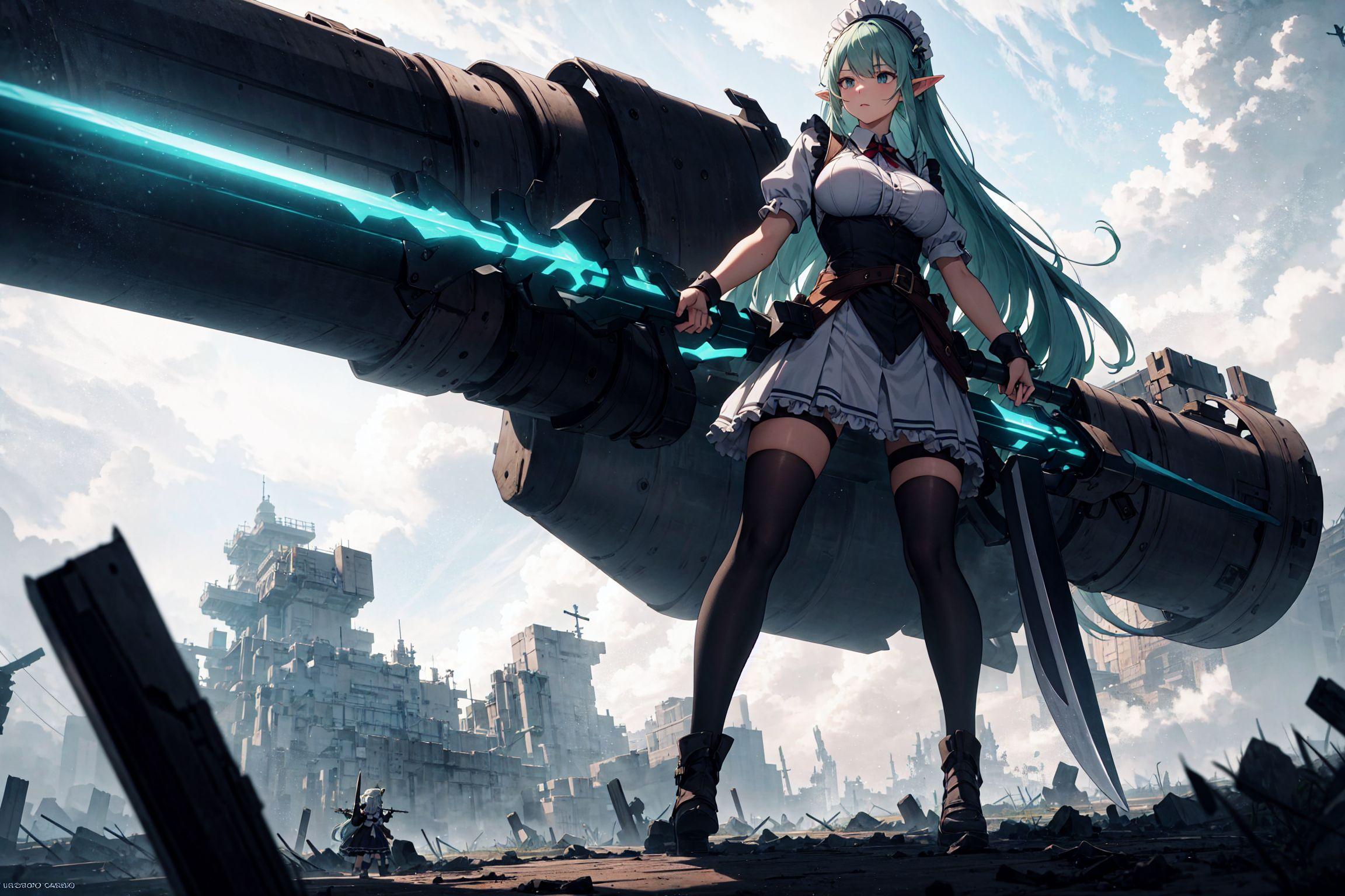 Steps: 25, Sampler: DPM++ 2M SDE Karras, CFG scale: 7.5, Seed: 1115873022, Size: 768x512, Model hash: 35b1f8b825, Model: ad2s, Denoising strength: 0.58, Clip skip: 2, Wildcard prompt: "hi res, heaven in maids, wielding (massive and (gigantic) 'WEAPON') her own size,\n(deformed), (aged down:1.3), large breast, cute elf girl, (looking away), (looking at another), detailed face, \natmospheric perspective, maid uniform, __expression__, __hairc__, __hairs__, white background, solo, holding weapon,\nnice hands, perfect hands,full body, pose,\n<lora:Silicon-landscape-isolation:1>", Hires upscale: 3, Hires upscaler: 4x_fatal_Anime_500000_G, Lora hashes: "Silicon-landscape-isolation: 6077cbf43340"