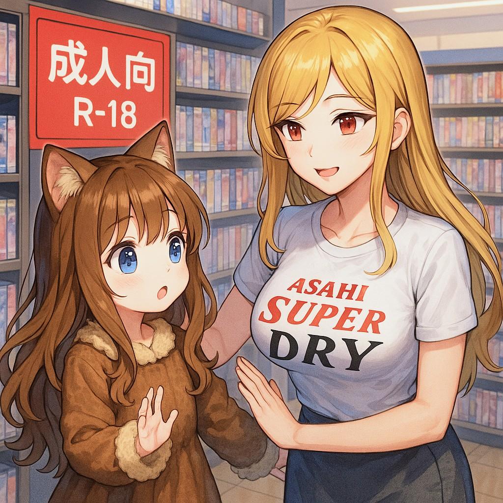 成人向けコーナーに行こうとする小さな女の子を止める擬人化ビール