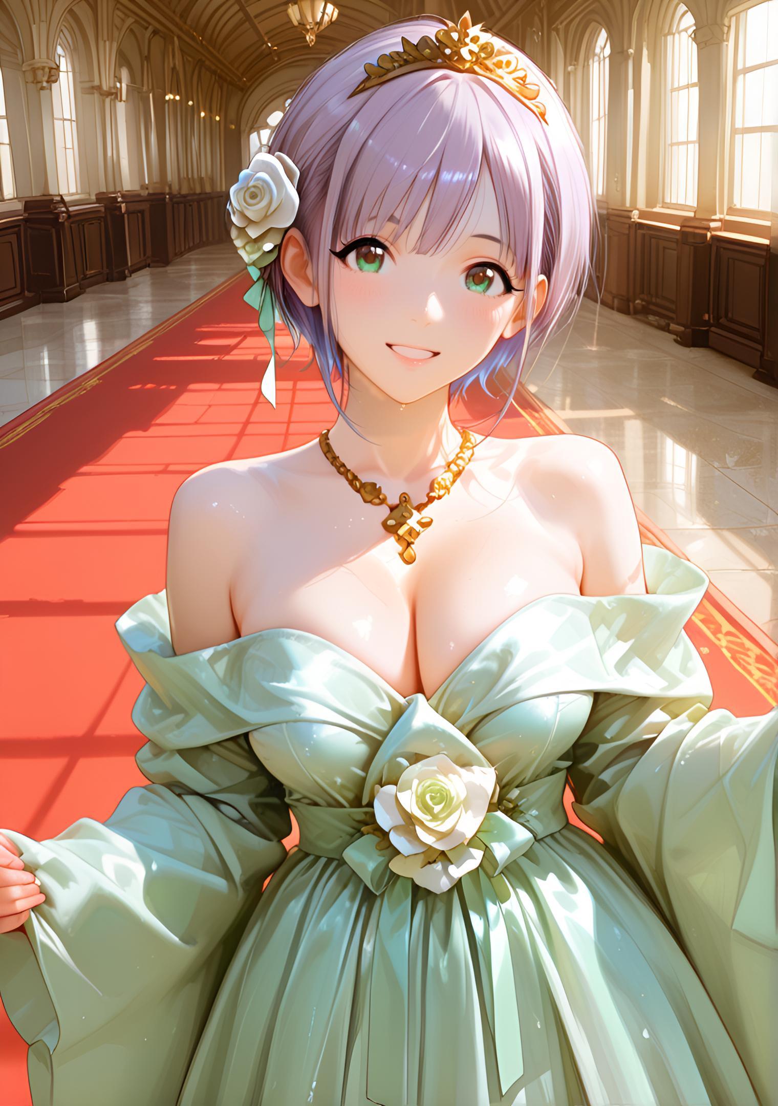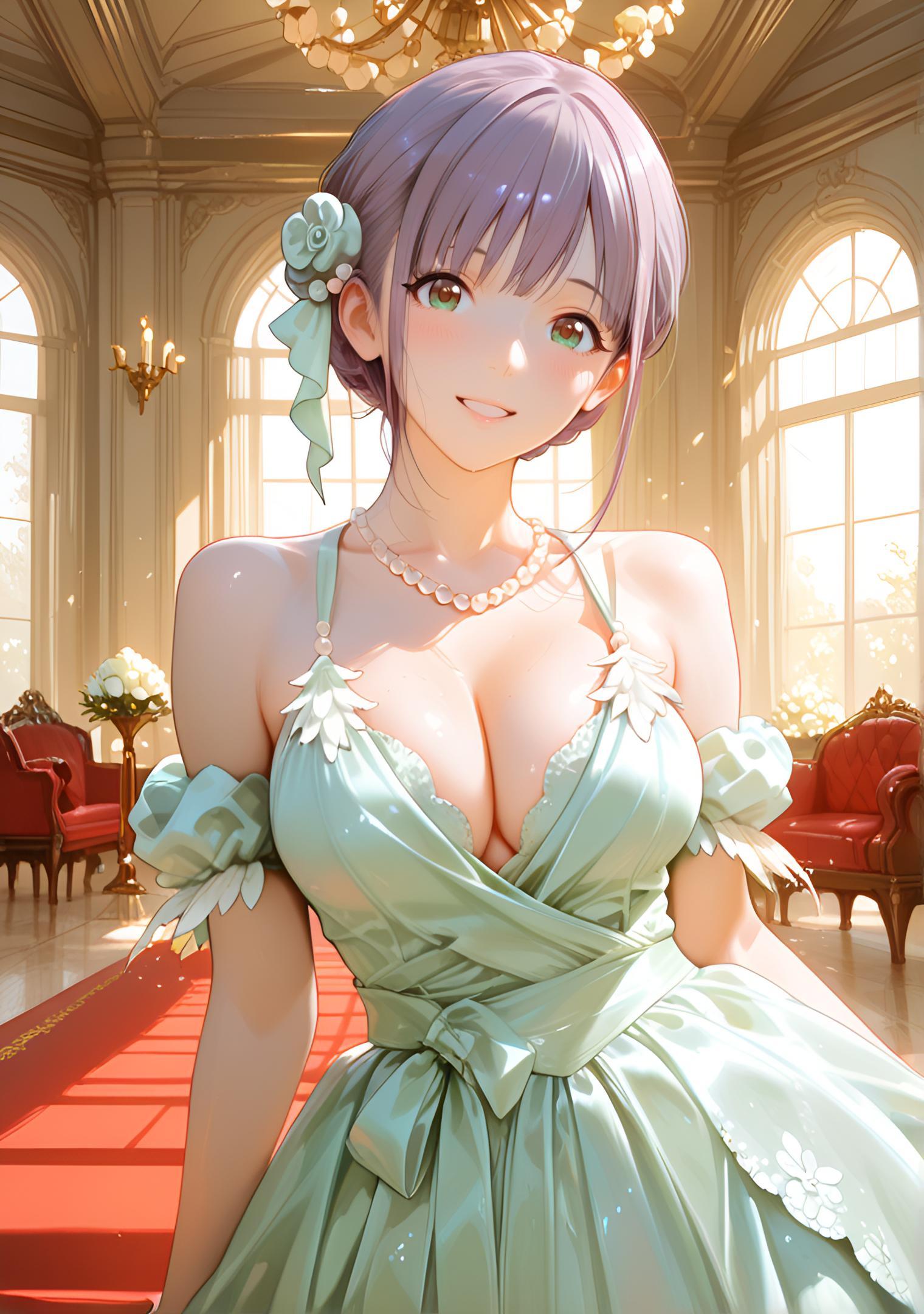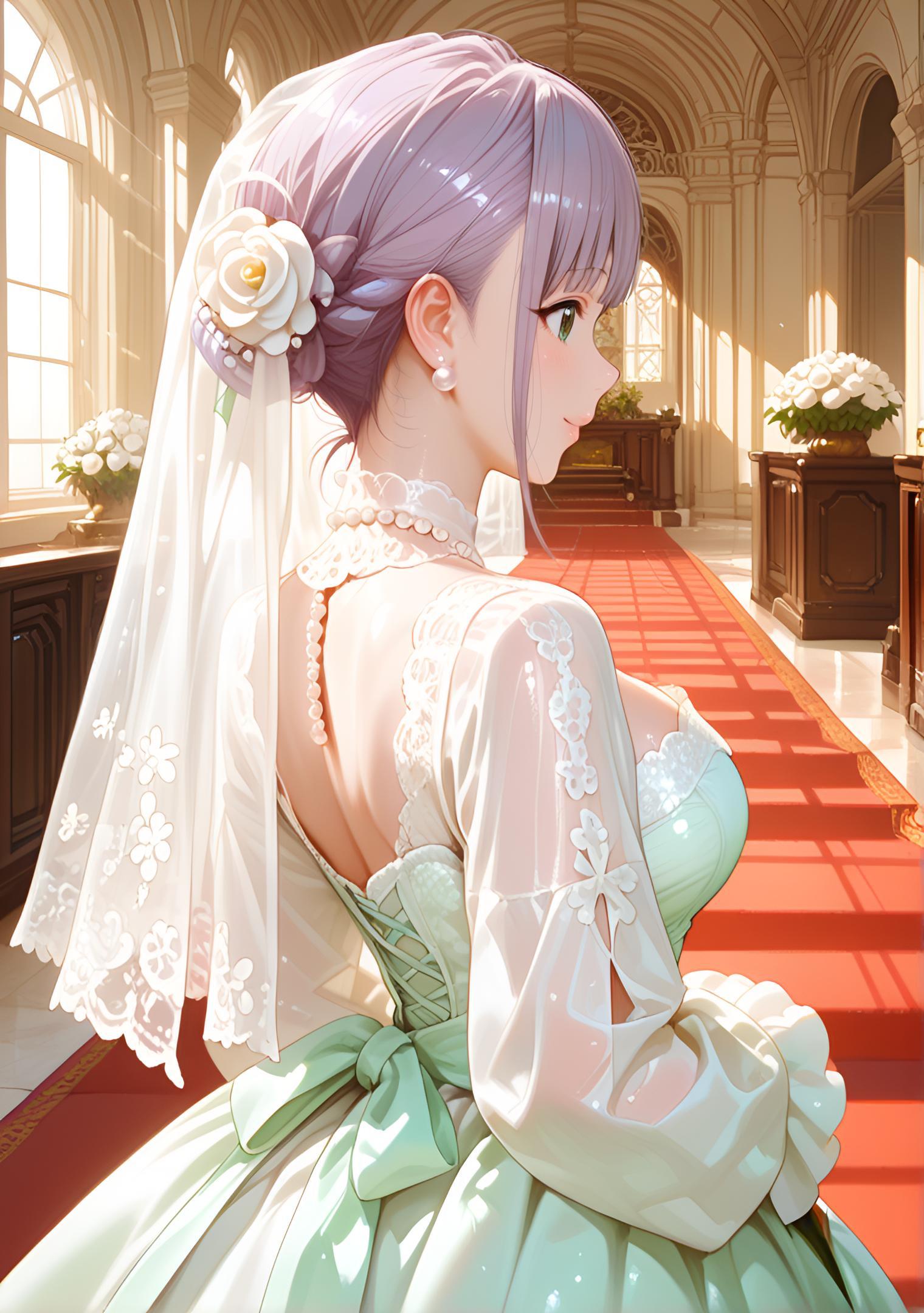 pale lavender gown with lace overlay, sheer neckline, silver hair comb, pearl necklace # 優美なラベンダーレースドレス