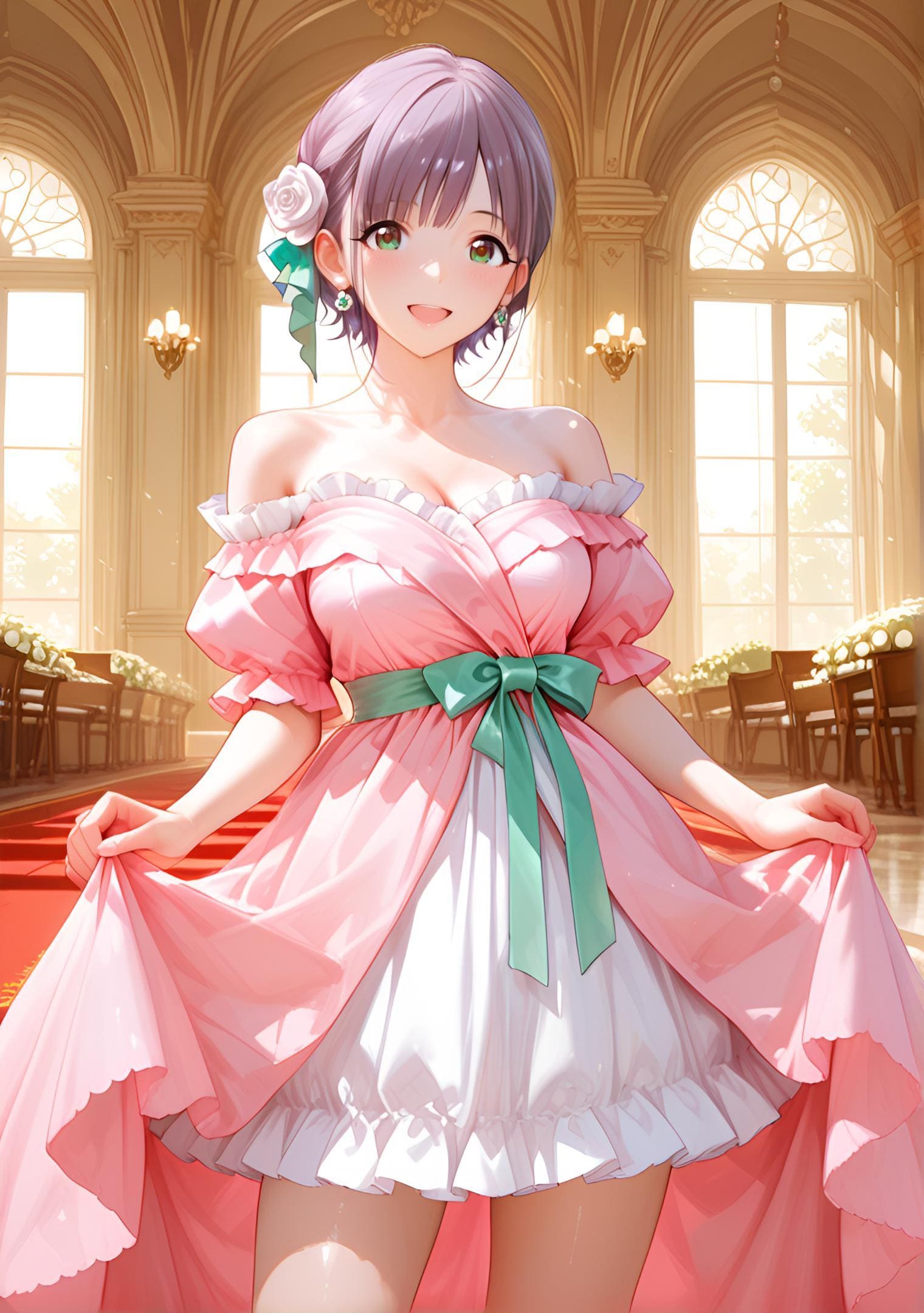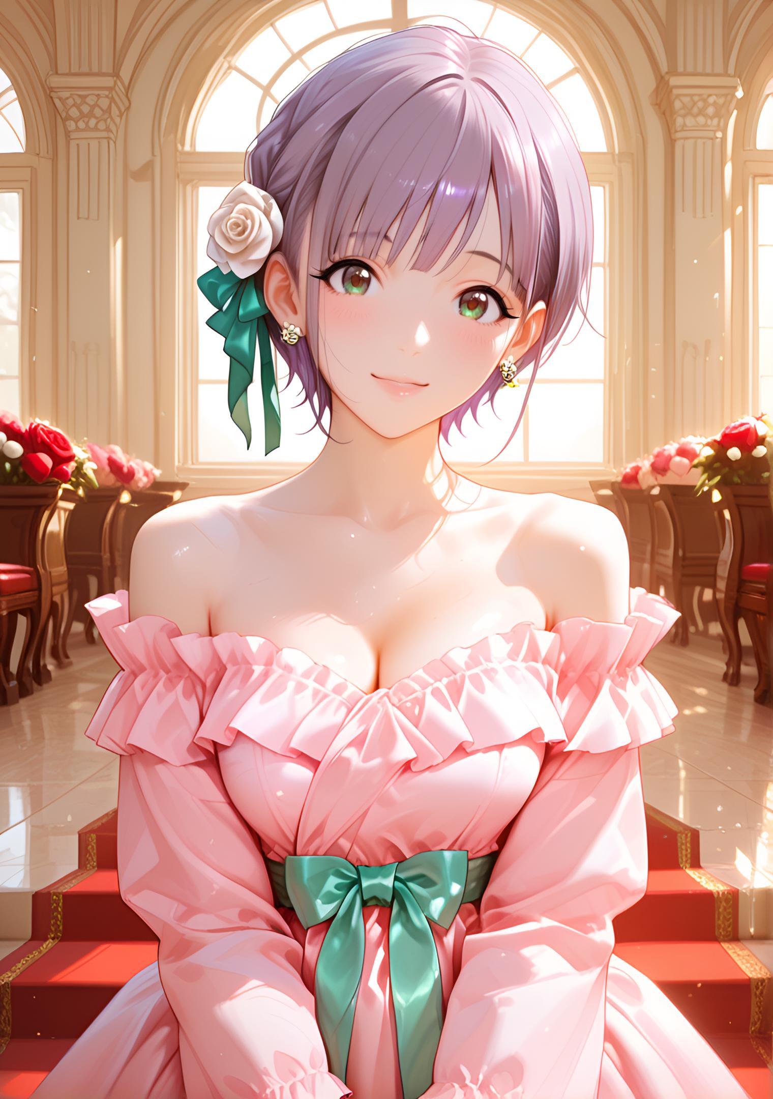 soft pink chiffon gown with ruffled shoulders, ribbon waist, floral earrings, rose hair accessory # 可憐なピンクシフォンドレス