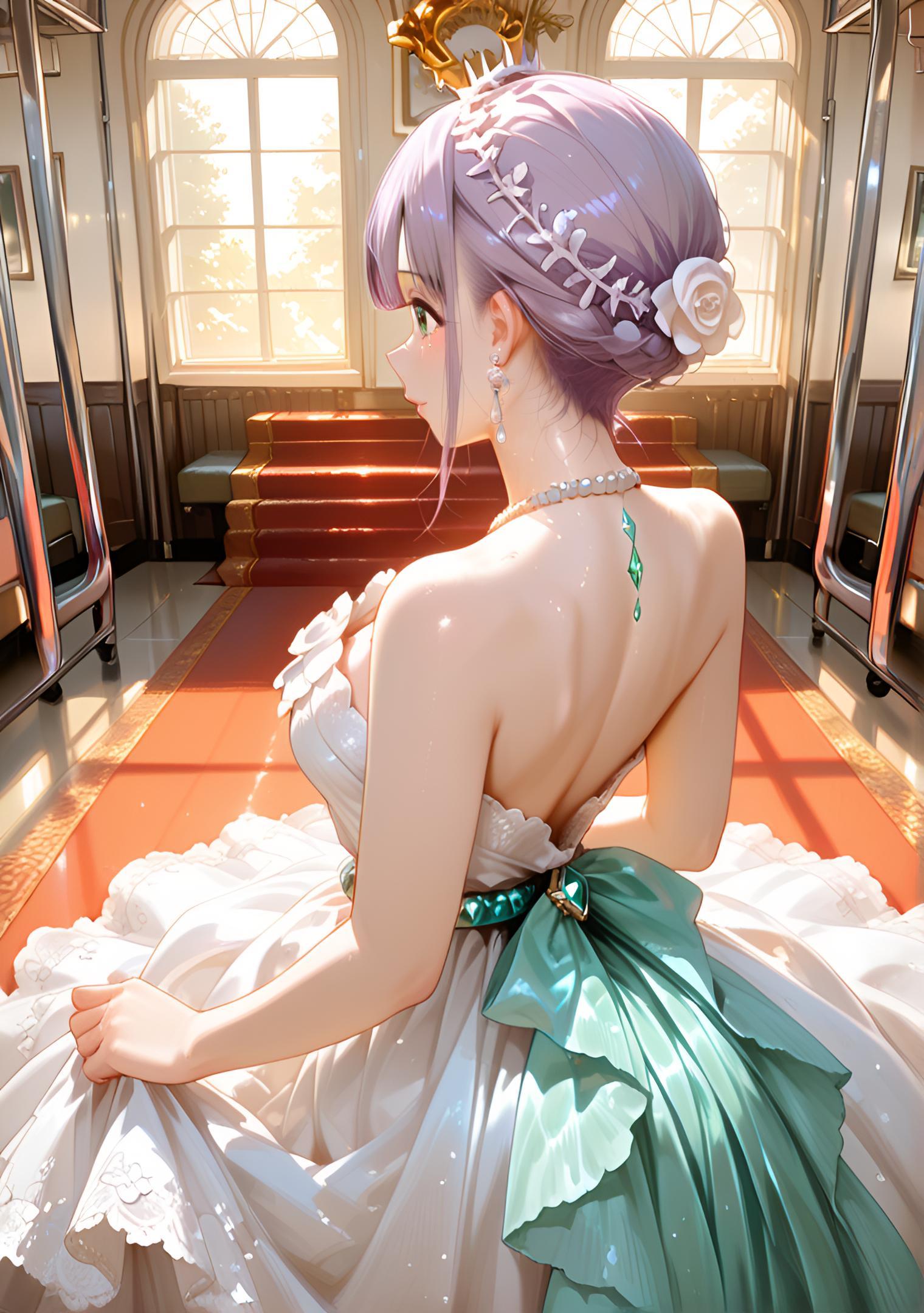 silver-white satin A-line gown with jeweled waistline, diamond hairpiece, drop earrings # 上質なシルバーホワイトのAラインドレス