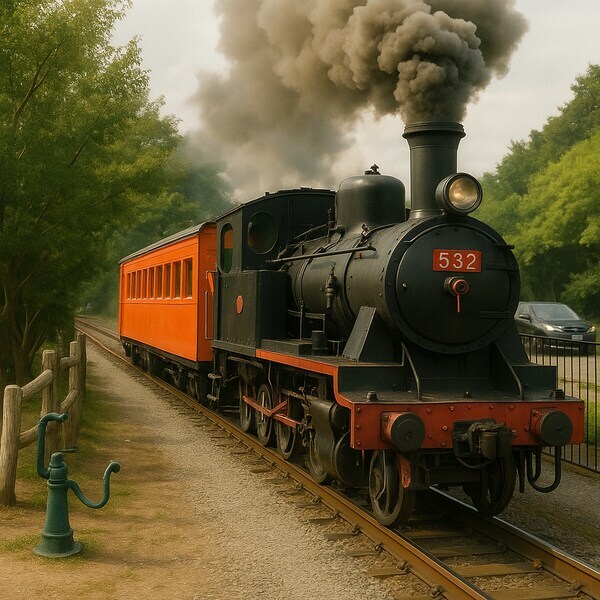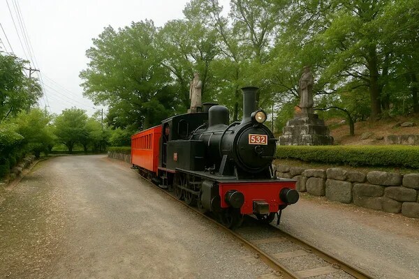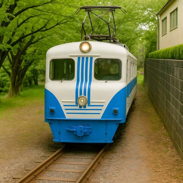 旧西武山口線の廃線跡と、かつてそこを走っていた車両の写真をChatGPTで合成して、往年のおとぎ列車を復刻。