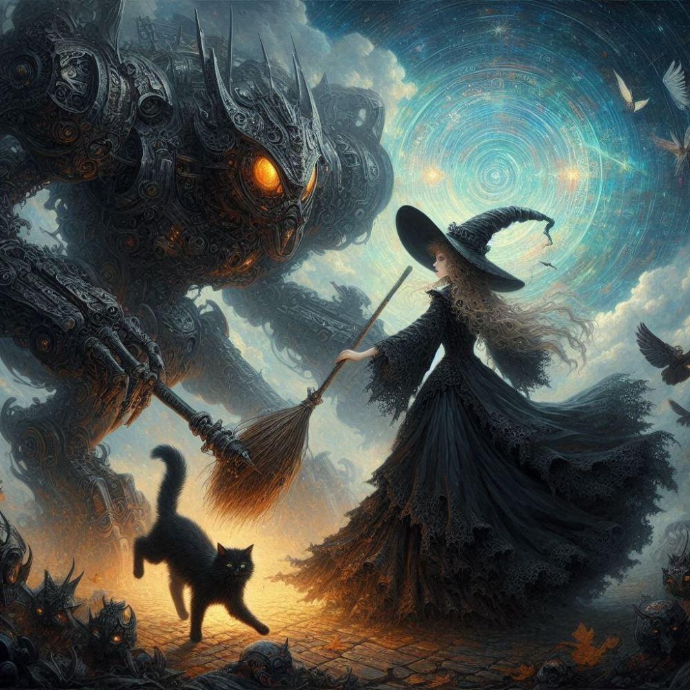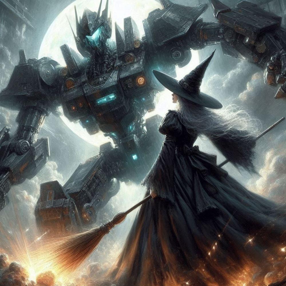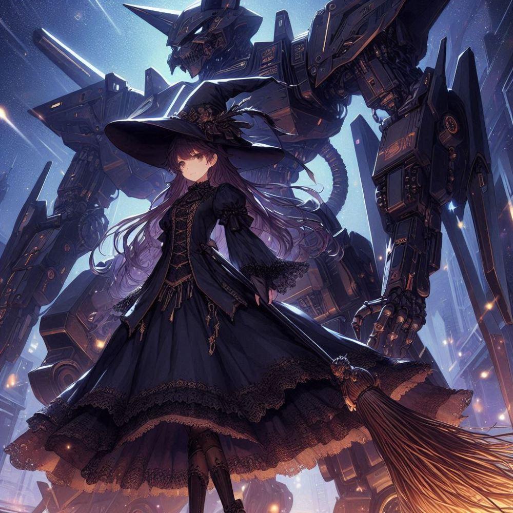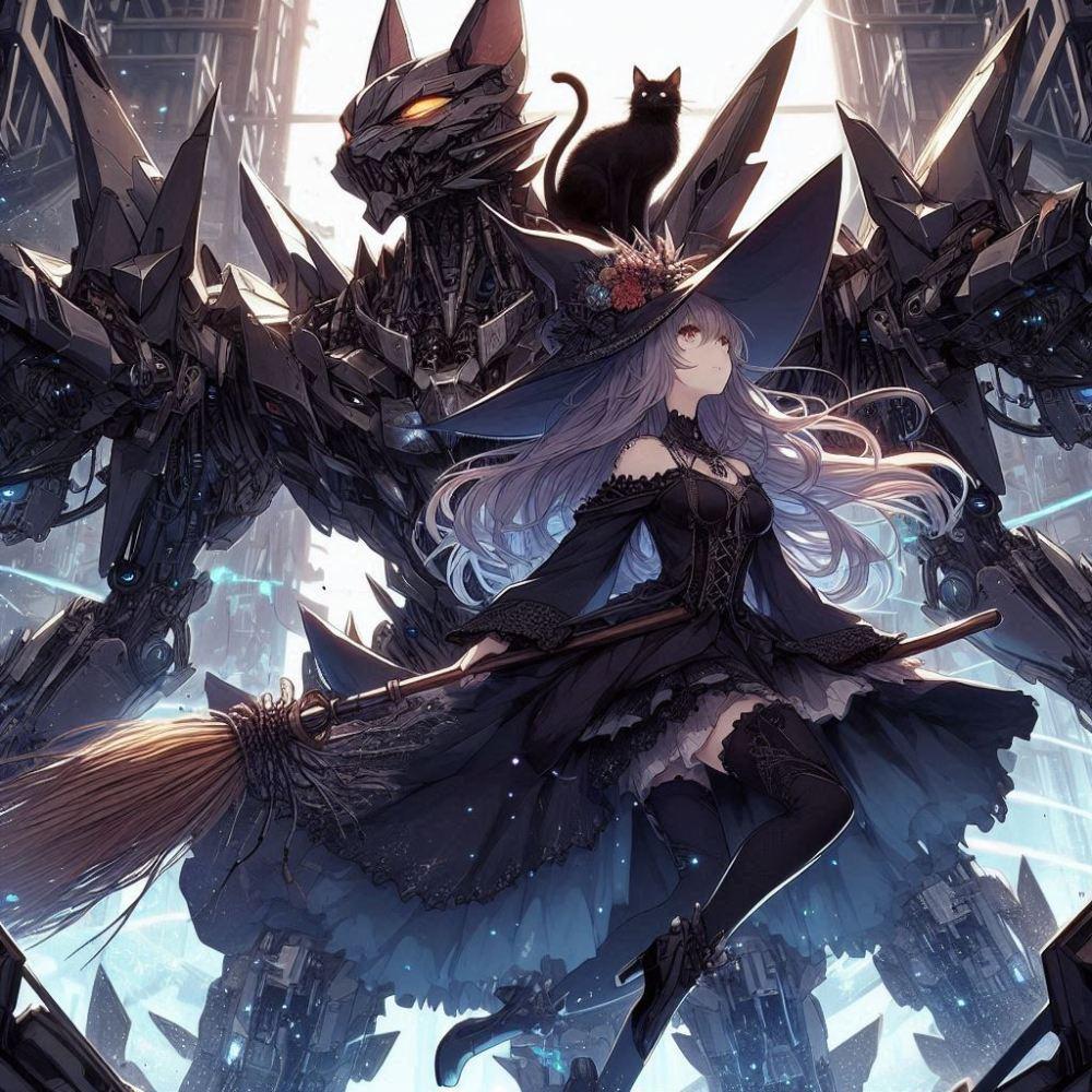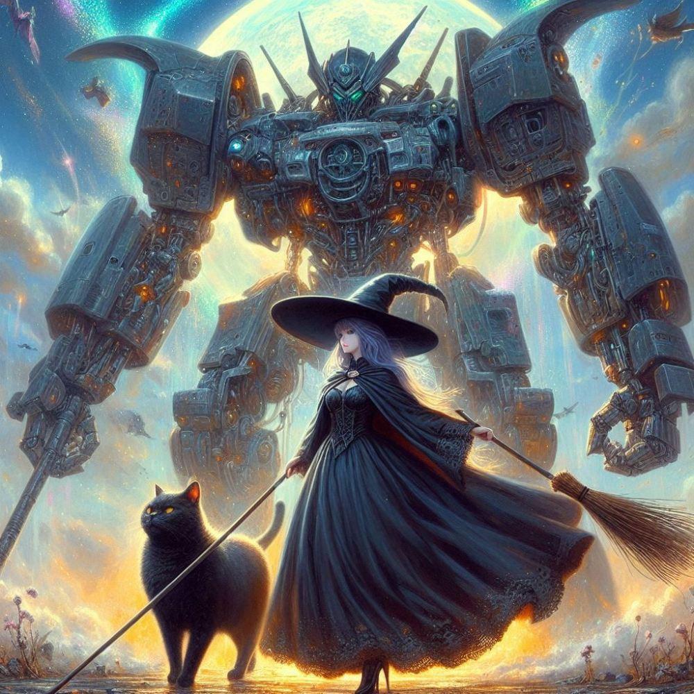 アニメ&油絵風ファンタジー、巨大猫ロボ魔法召喚魔女