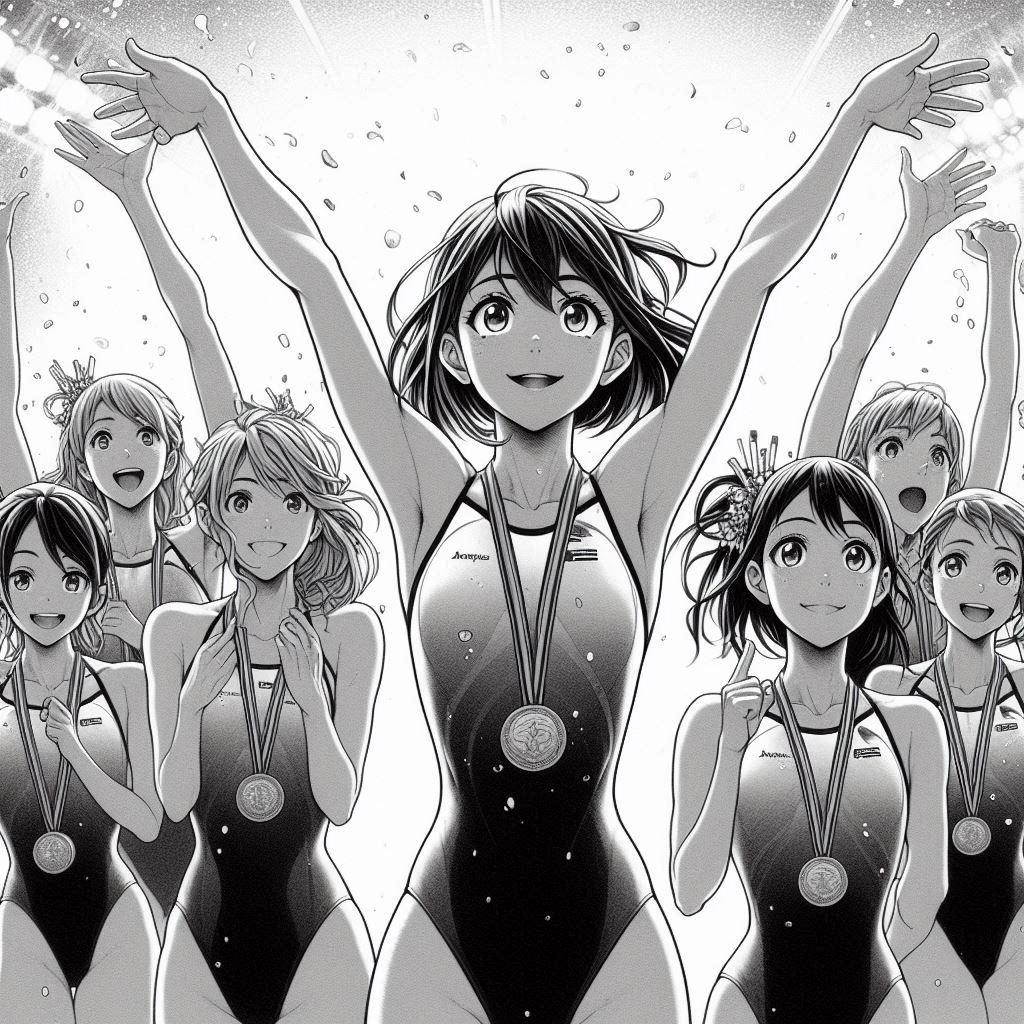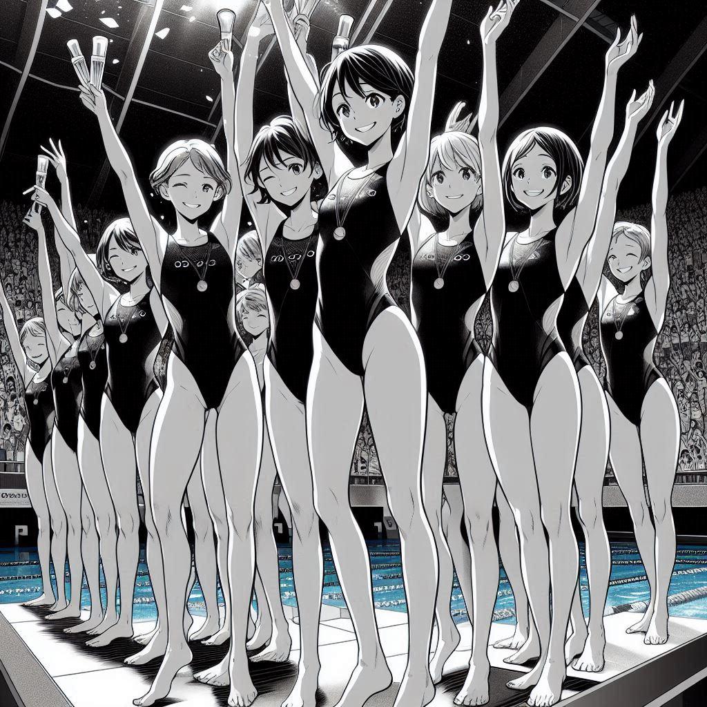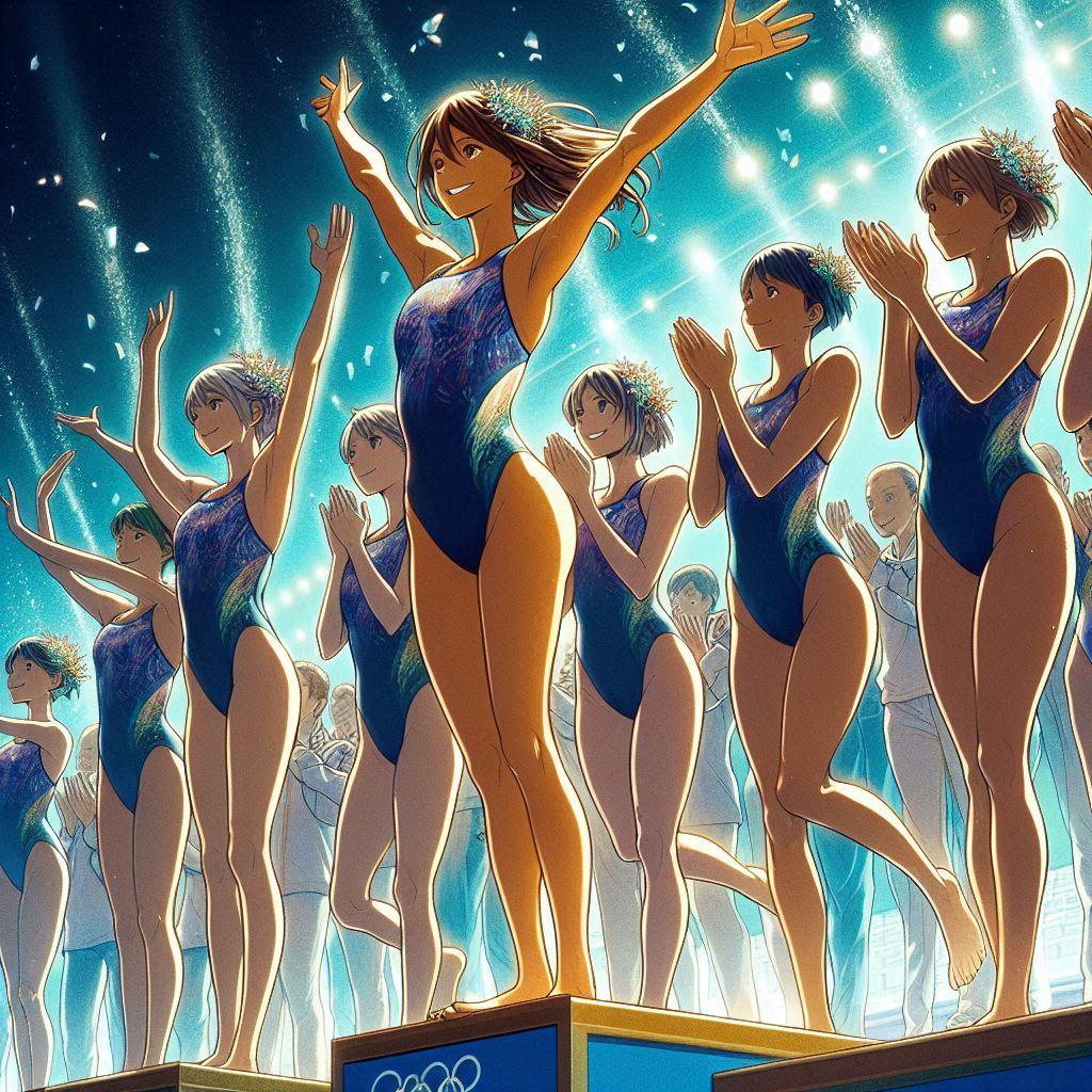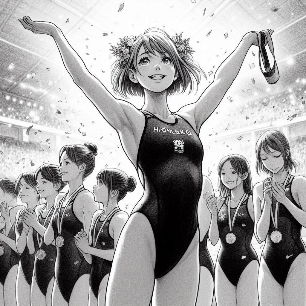 現状、水泳競技界隈でまともなハイレグ競技は”シンクロ”と”飛び込み”だけ?だと思うのですよ?(実際、今のシンクロ日本代表のワニ?ハイレグは凄い角度ですね😍)そこで、より高確率でDalle先生にハイレグを召喚してもらう為、競技をシンクロにしたら予想通りかなりの高確率で競泳選手の水着がハイレグ?になりました。(以前の投稿で一度成功しているので”シンクロ”が有効なのはある程度確信がありました!)