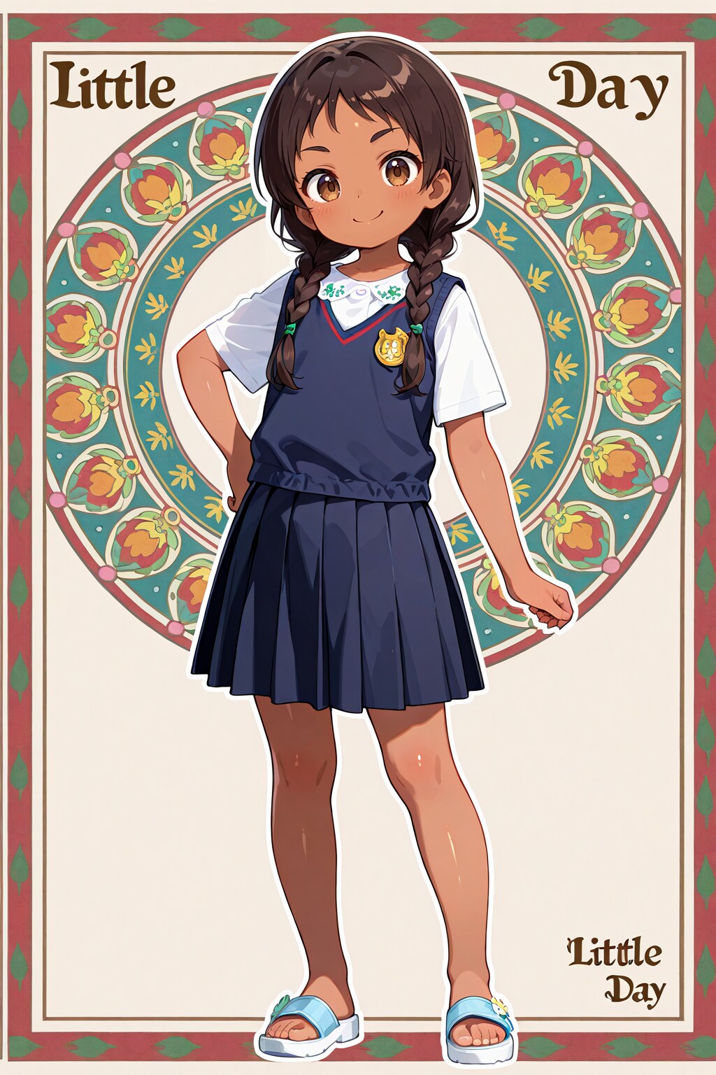 インドの女子学生制服:白い半袖ブラウス、紺色ベスト、長めの紺プリーツスカート、校章入り、サンダルまたはフラットシューズ。肌はミディアムブラウン、瞳はダークブラウン、髪は黒のロング三つ編み。