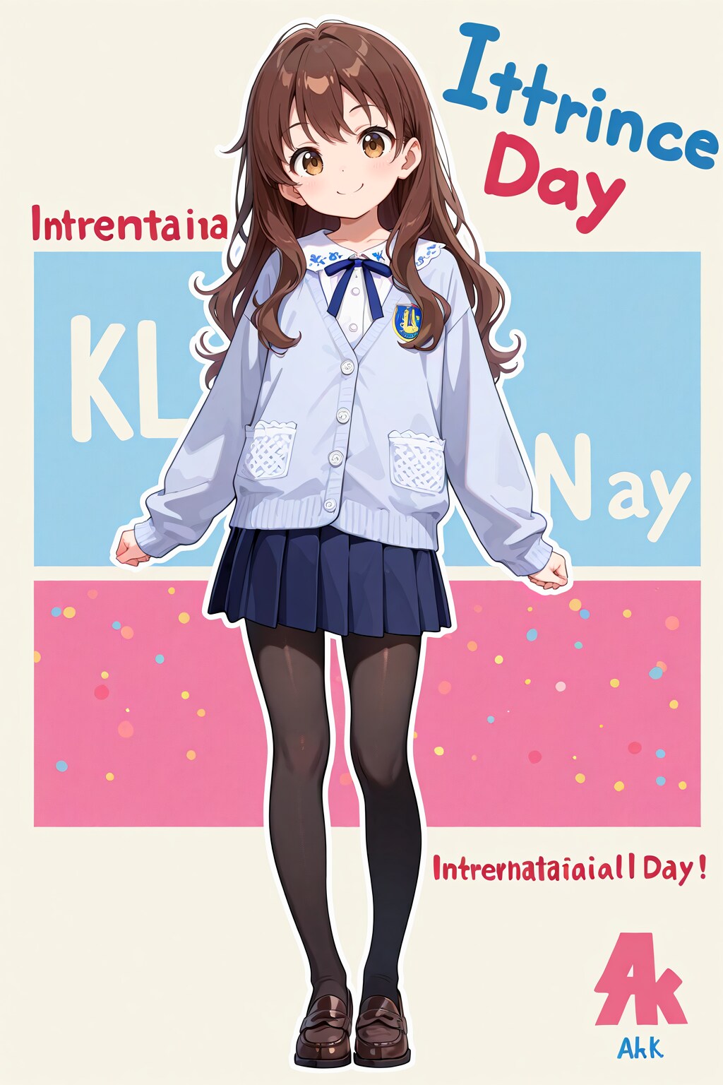 フランスのリセ風制服:ネイビーのカーディガン、白ブラウス、スリムプリーツスカート、黒タイツ、エレガントなローファー。肌は色白、瞳はヘーゼル、髪は茶色のウェーブロング。