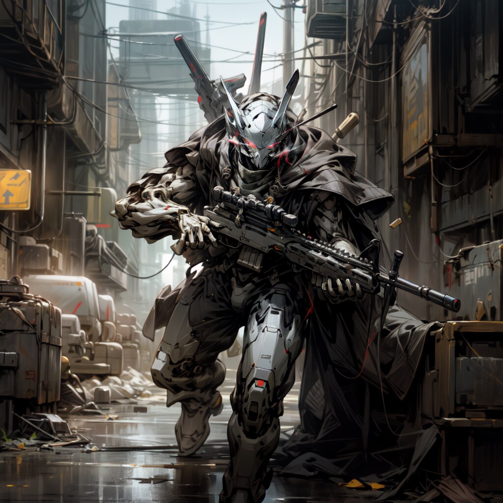 元の設定では目が単眼のモノアイでカメラが左右に動く感じになっていたのですがどうもうまくいかず、なんか両目が光っててヤバそうでカッコイイしAIイラスト版はもうこれでいいやということにしました(適当) ほんとはサイボーグ用の重アサルトライフルとかしっかり持たせてあげたいですね...