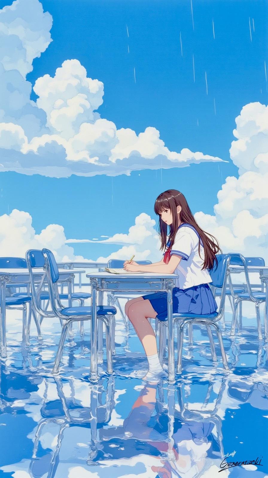 雨がやんだあとの床には空が映り、机の脚も彼女の想いも、どこかに溶けて消えていくみたいだった。