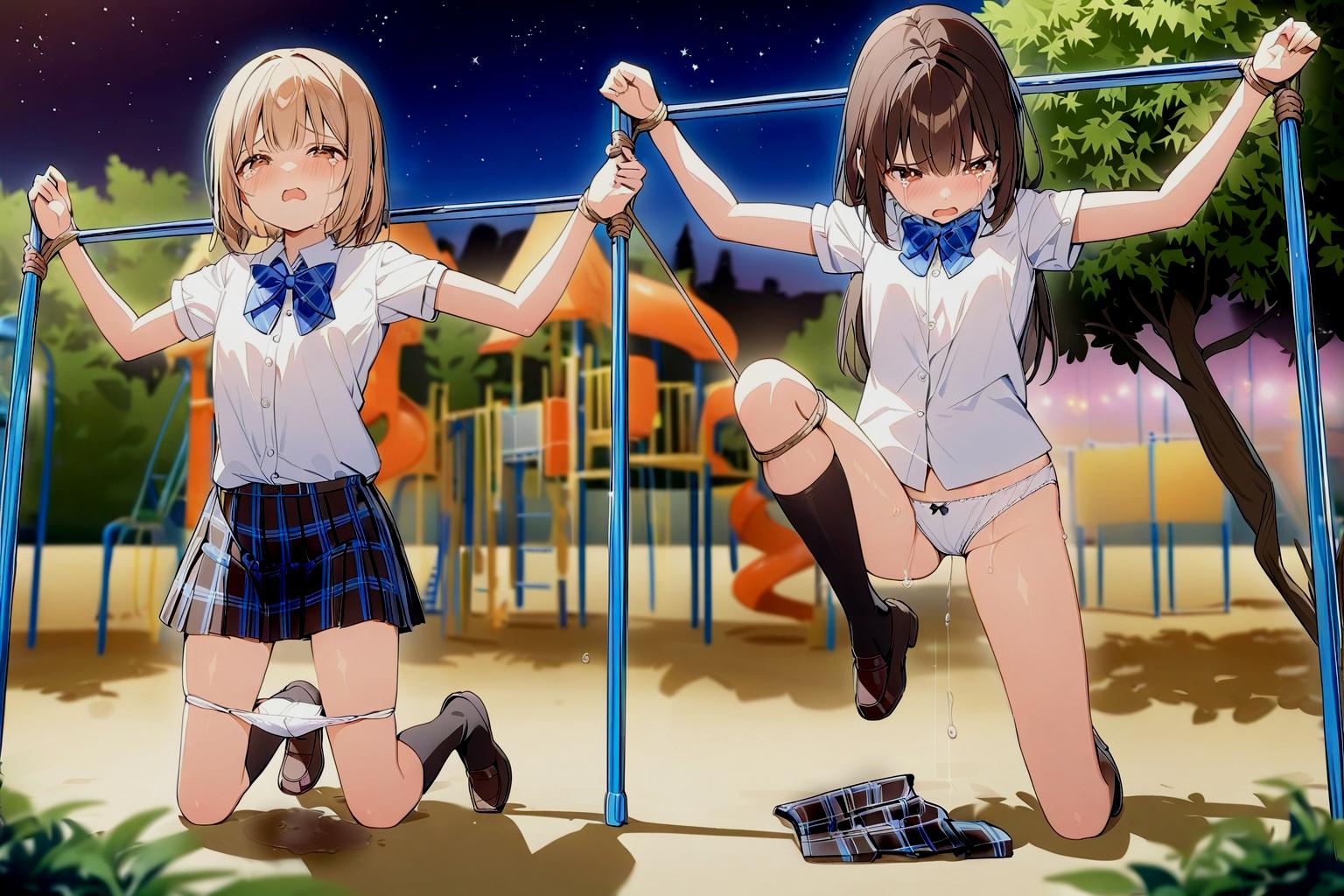 夜の公園の鉄棒にJK二人を拘束放置