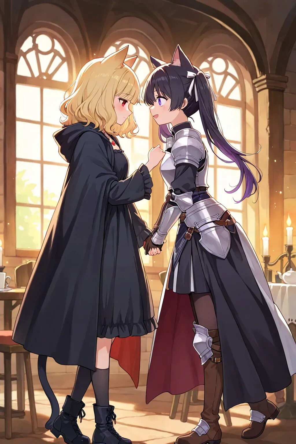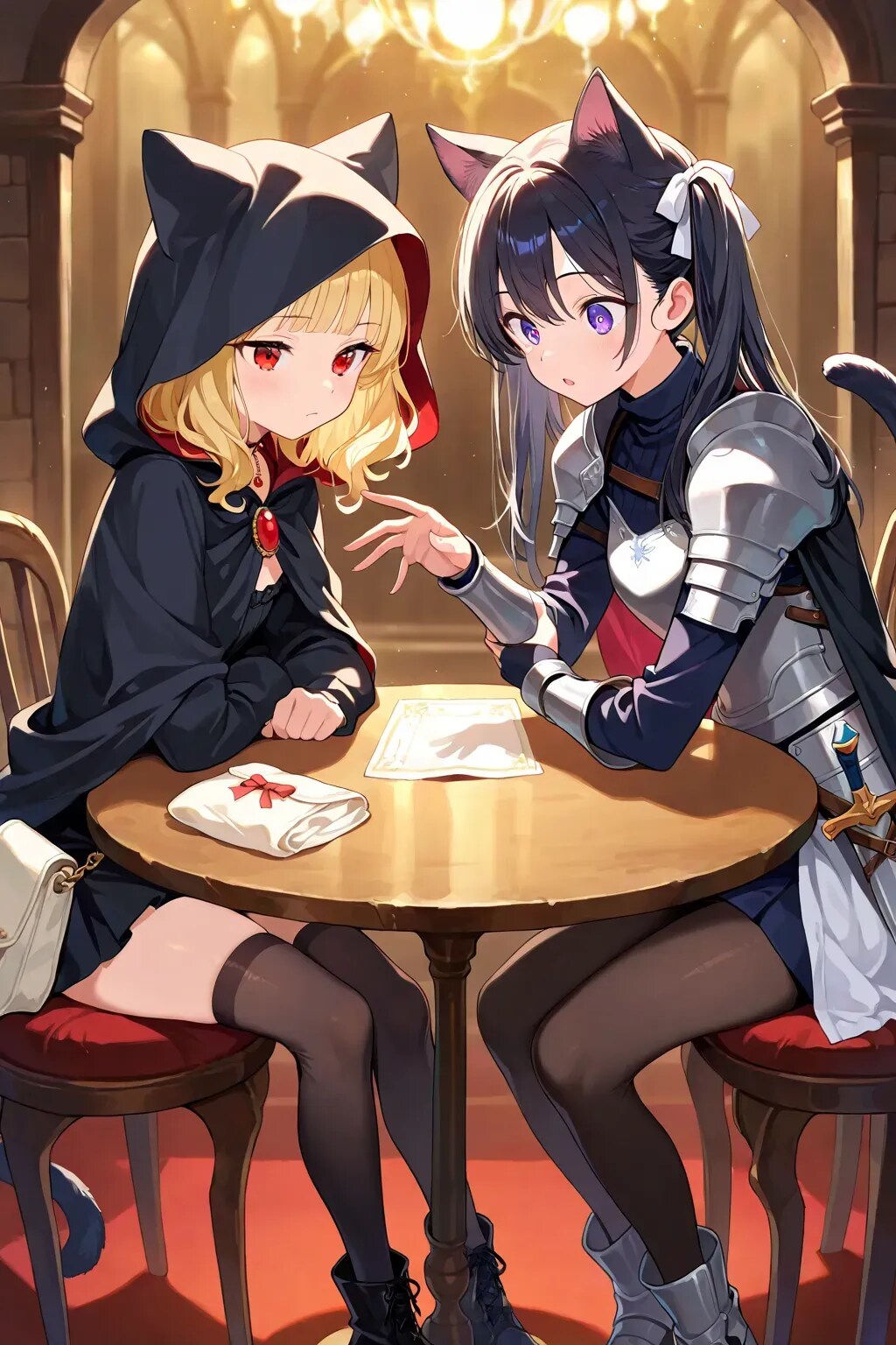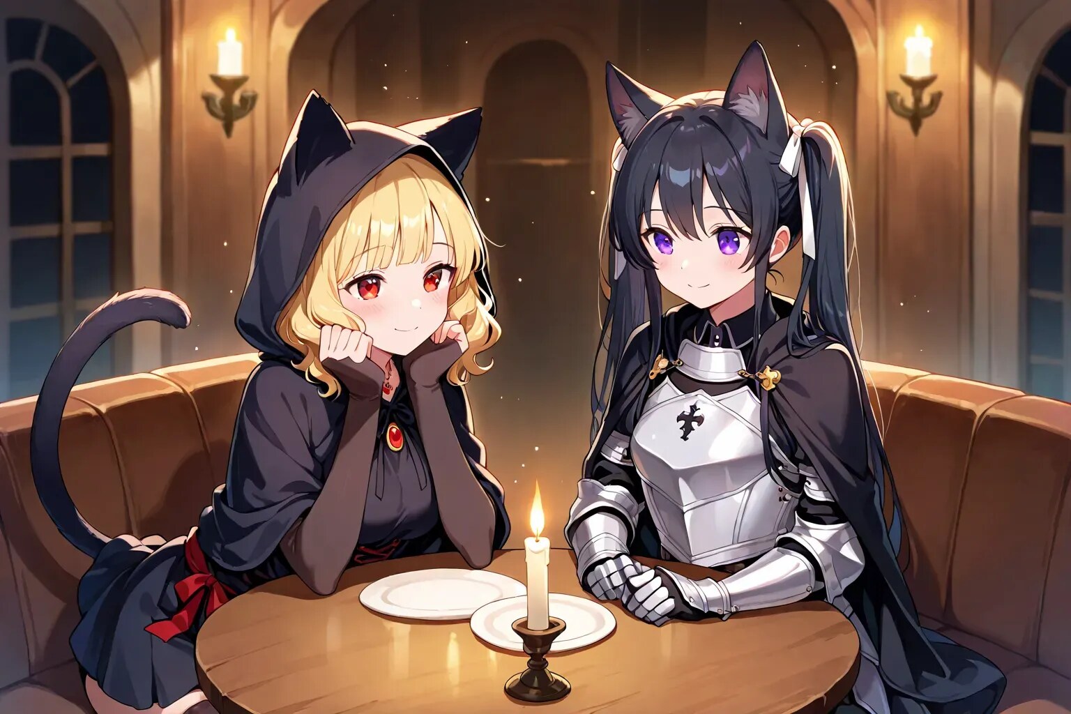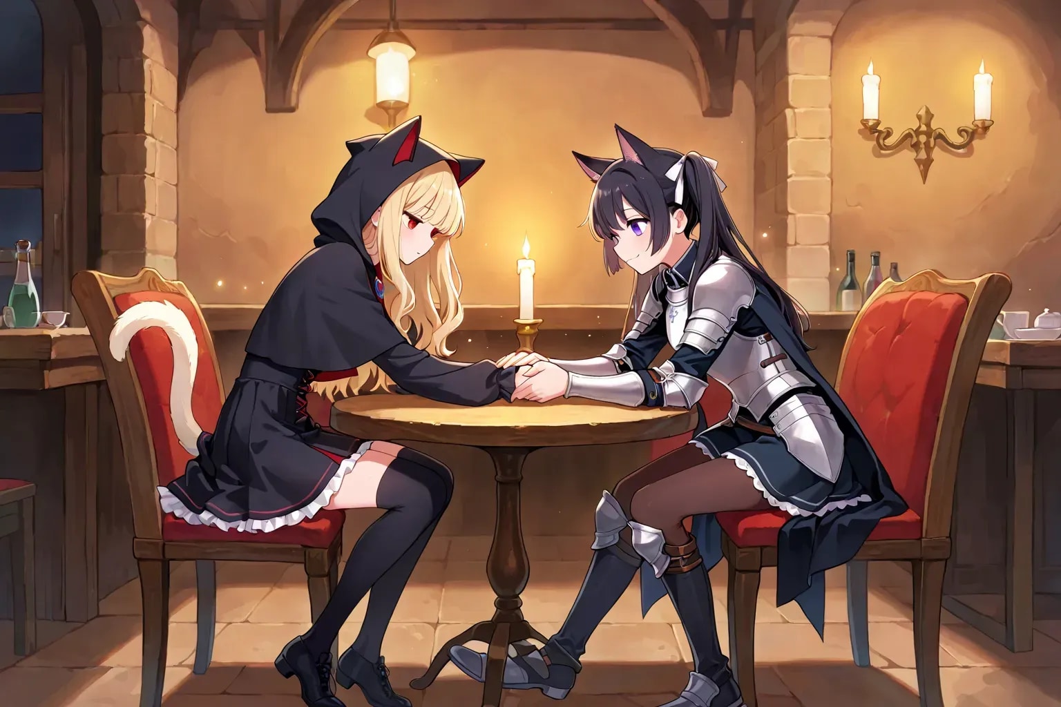最後の目的を果たし、私はある人を待っていた。 魔王軍カフェの片隅。蝋燭の光に照らされたテーブルの前に、黒猫騎士──カペラニカが現れる。