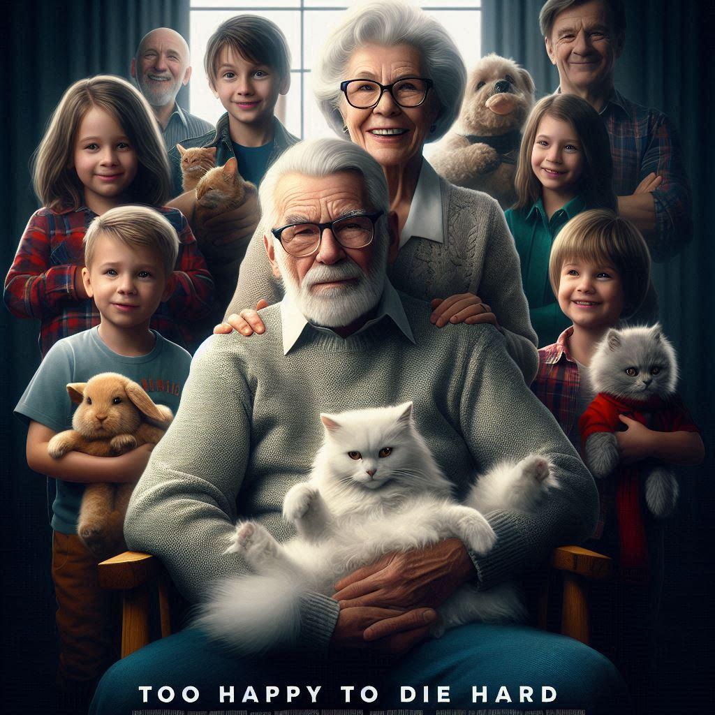 老年の夫婦が子供や孫、可愛いペットに囲まれて