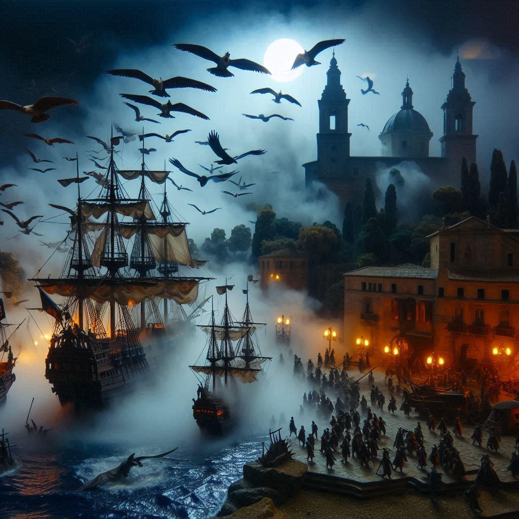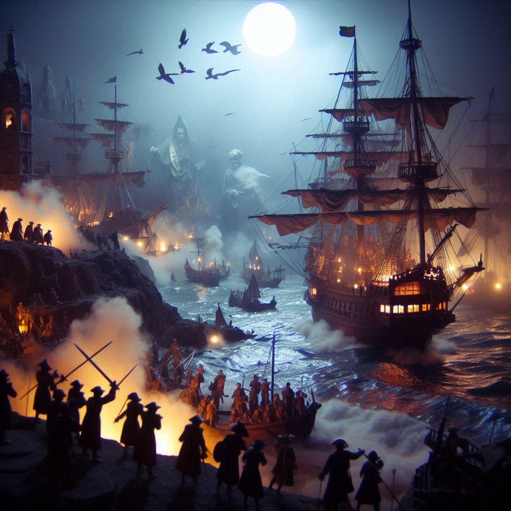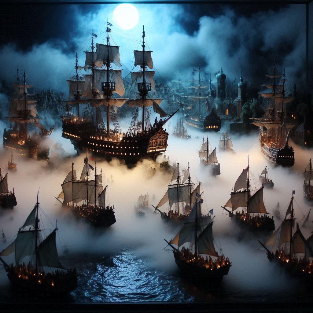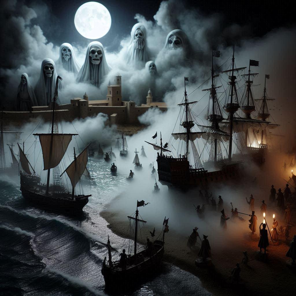 何をどうやったのか、艦隊化した幽霊船たちが一斉砲撃。敵の一角を崩し、注意を引くも。