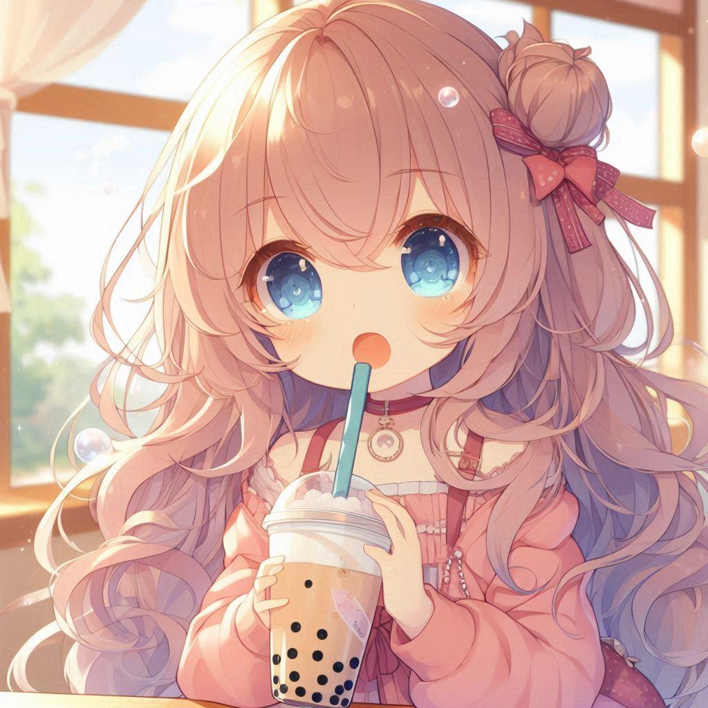 タピオカミルクティーを飲んでる小さな女の子