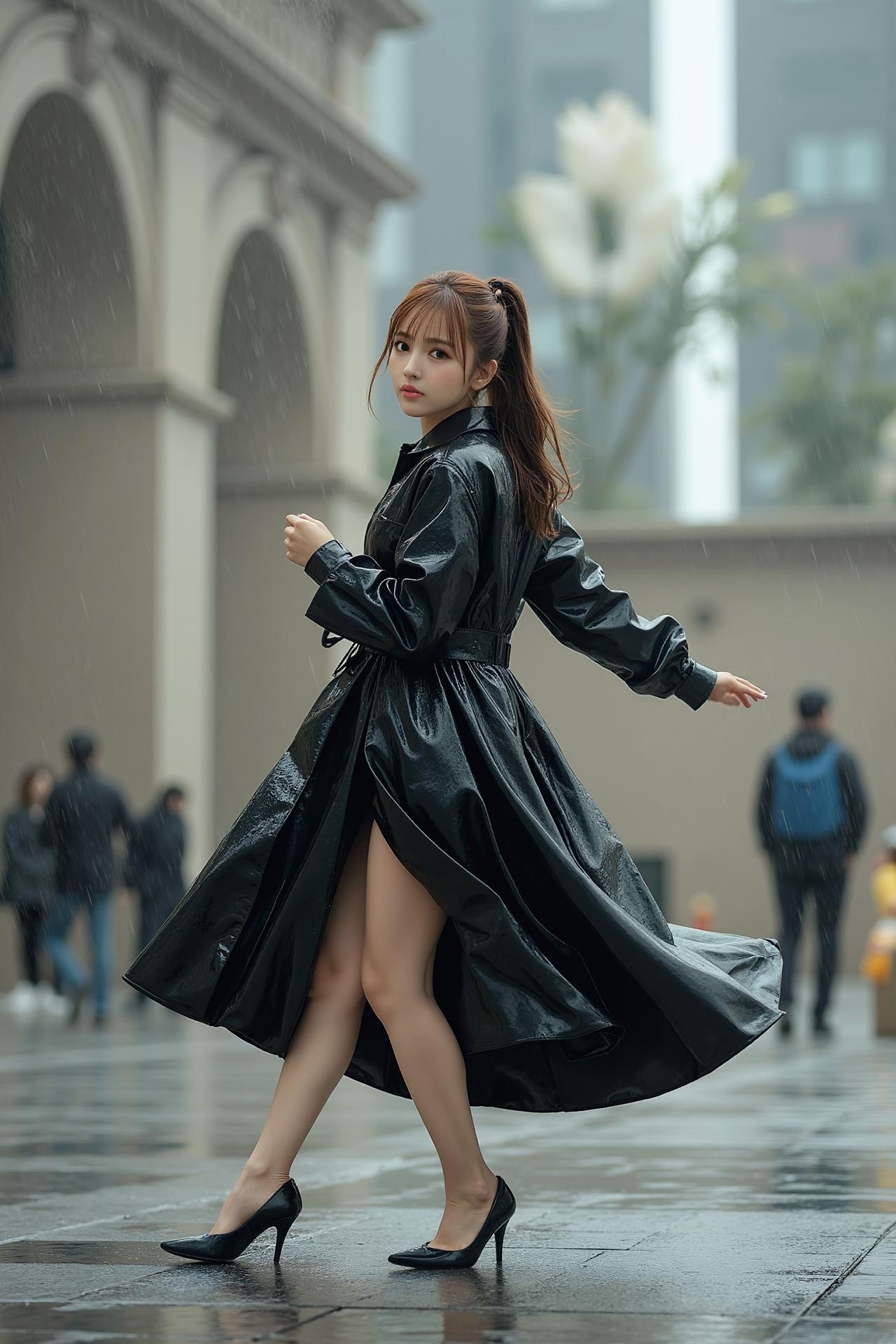 ・アートギャラリー前で全身タイトな?レインコート、片足を上げて踊るようにスピン。