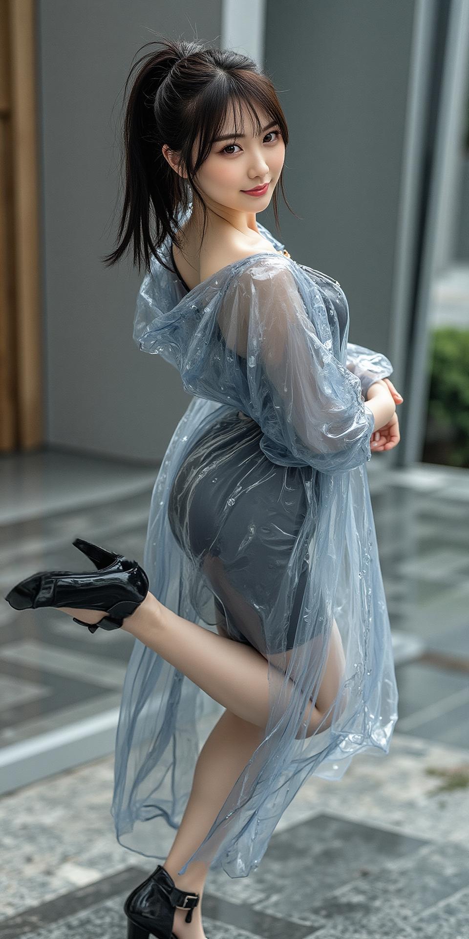 ・透明PVCレインコートが風に舞い、内側が浮かび上がる。