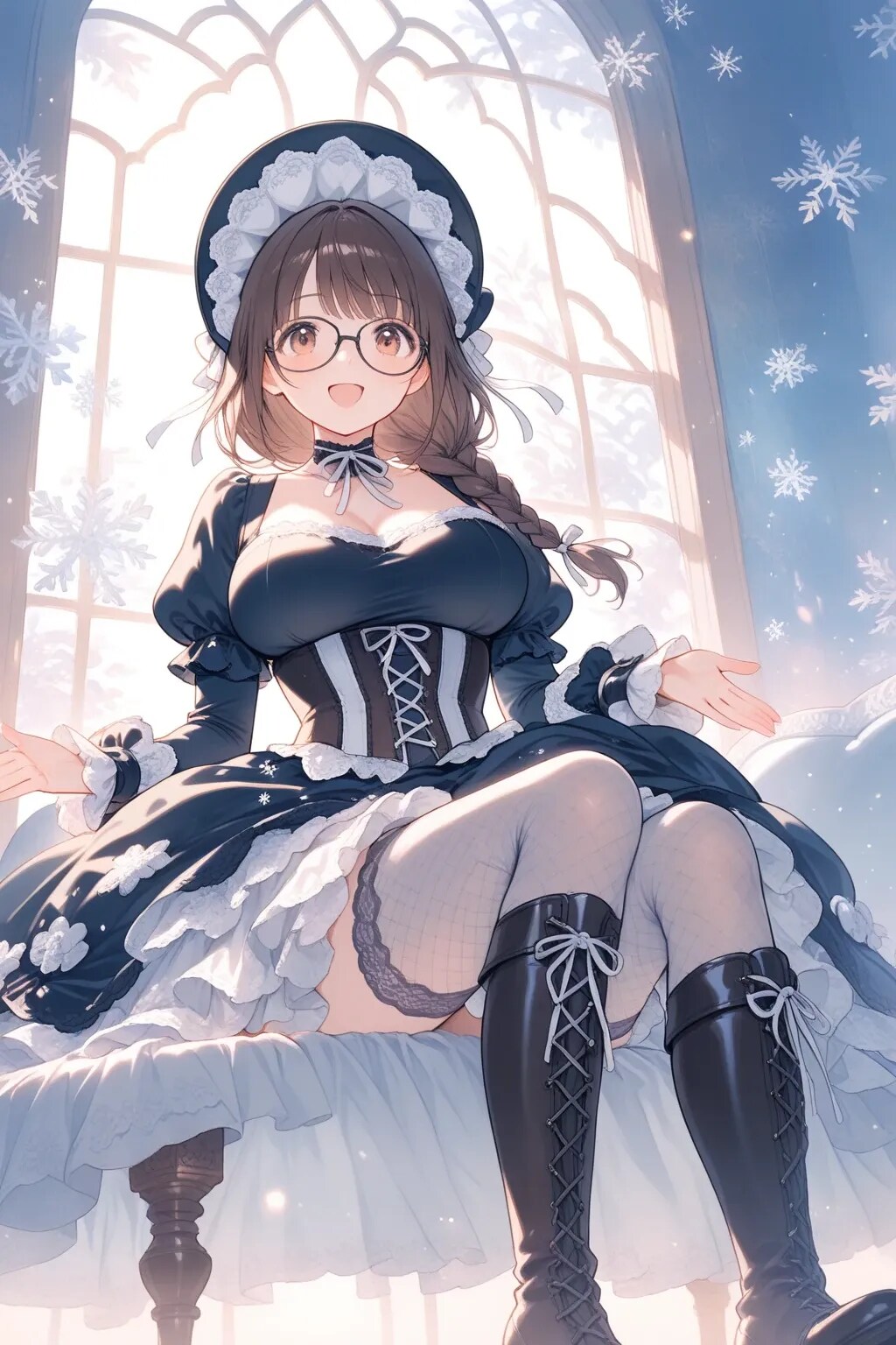 冬の午後、雪が舞う窓辺で、舞ちゃんは黒と白のクラシカルロリィタに身を包んで座っている。手元にはシュトーレンとミルクティー。外は寒くても、舞ちゃんの笑顔はとてもあたたかい。窓越しに雪の結晶を眺めながら、ぽつりと。