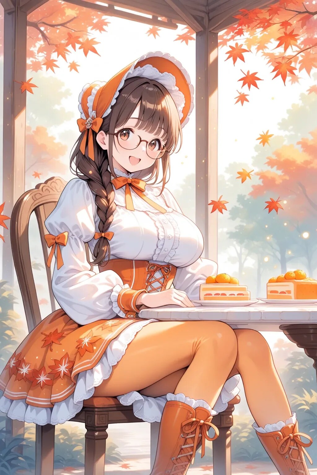 秋のカフェテラス、色づいた紅葉がひらりひらりと舞い落ちる。舞ちゃんはオレンジ色のロリィタドレスに身を包み、マロンケーキを前にうっとり顔。ふわっと立ちのぼる紅茶の香りと、甘くてほっこりする秋スイーツ。この季節にしか味わえない、特別な時間に舞ちゃんはこうつぶやく。