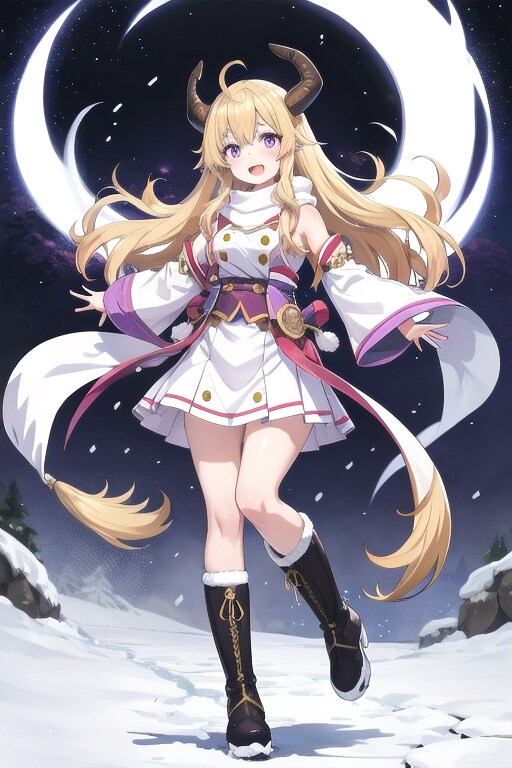 tunomaki Watame, bard, ram's horns, blonde, long hair, ahoge, purple eyes, winter clothes, exposed shoulders, white scarf, white dress, black half boots, full body, singing, perfect anatomy, perfect 5 fingers