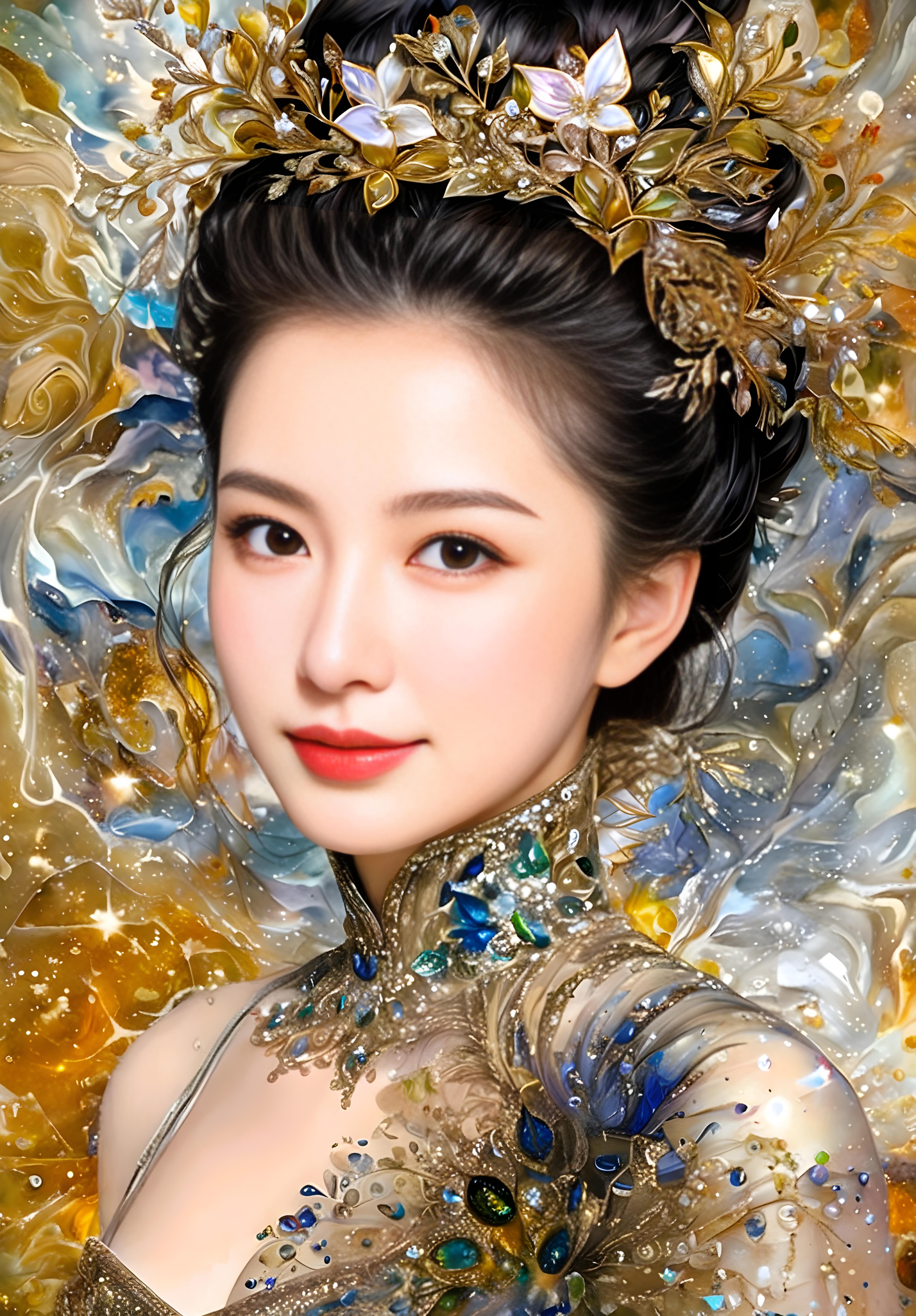 花飾りと孔雀の飾り羽をあしらったシアードレスを着た女性
