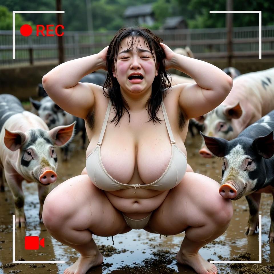 逃亡デブに天罰💥🐷 太い肉体が招いた末路:豚に処理される女子の屈辱動画、永久公開決定!
