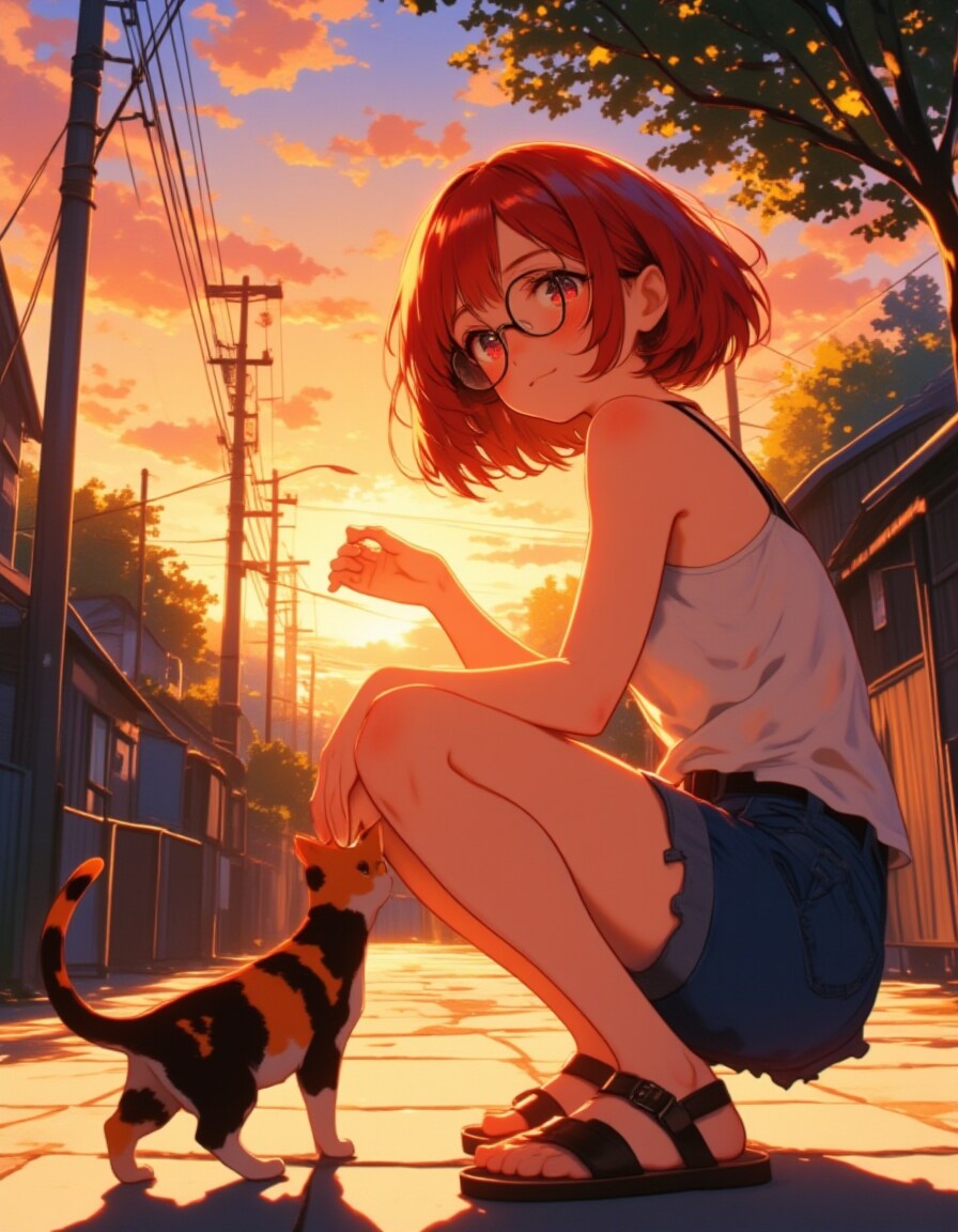A sunset scene with a red-haired girl with bob-cut hair,wearing round black glasses and a soft smile,crouching on the sidewalk while petting a curious calico cat. Her freckled face glows with the light of dusk. She wears a casual white camisole,denim shorts,and sandals,and the setting sun casts long shadows behind her. Captured from below,emphasizing her friendly posture and the calm atmosphere. Emotional expression,delicate details,photoreal anime realism. masterpiece,best quality,(real skin:1).,