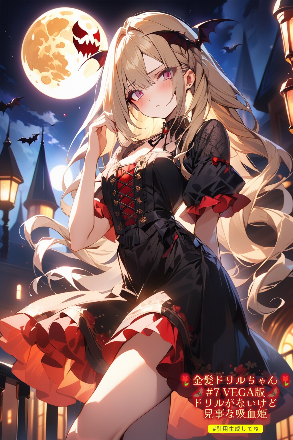 ヴァンパイアでない"金髪ドリルちゃん"を今後どなたかがうちの子キャラにしてタグに使う可能性も考慮して、一意性を高めるため"吸血鬼"を追加して金髪+ドリル+吸血鬼の3要素で、"金髪ドリル吸血鬼ちゃん"としました。現状、タグ検索でキャラクターの被りはないのを確認しています。