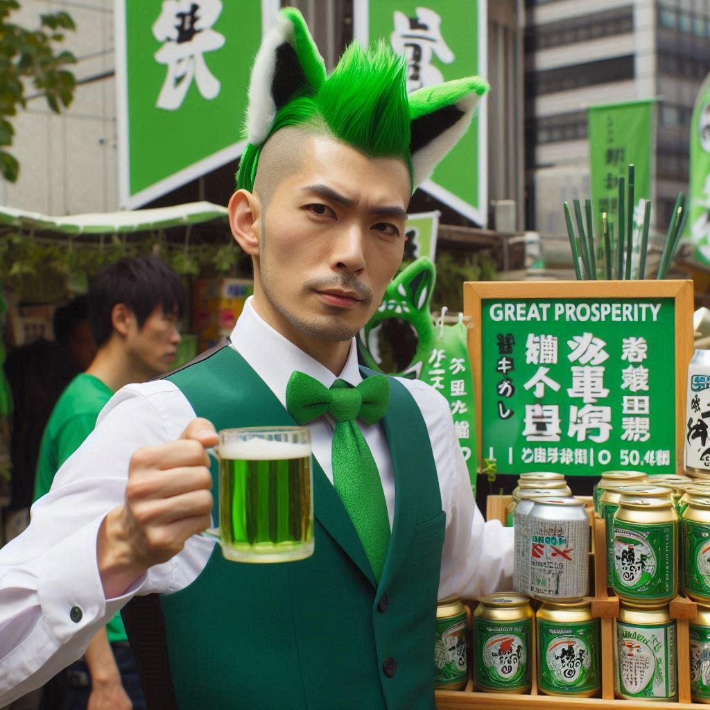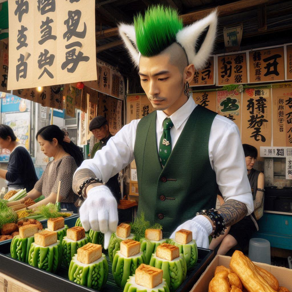 ゴーヤに油揚げを詰めたおつまみ、ホップに加えてゴーヤの苦味が癖になるゴーヤビールが各580円で販売中です。