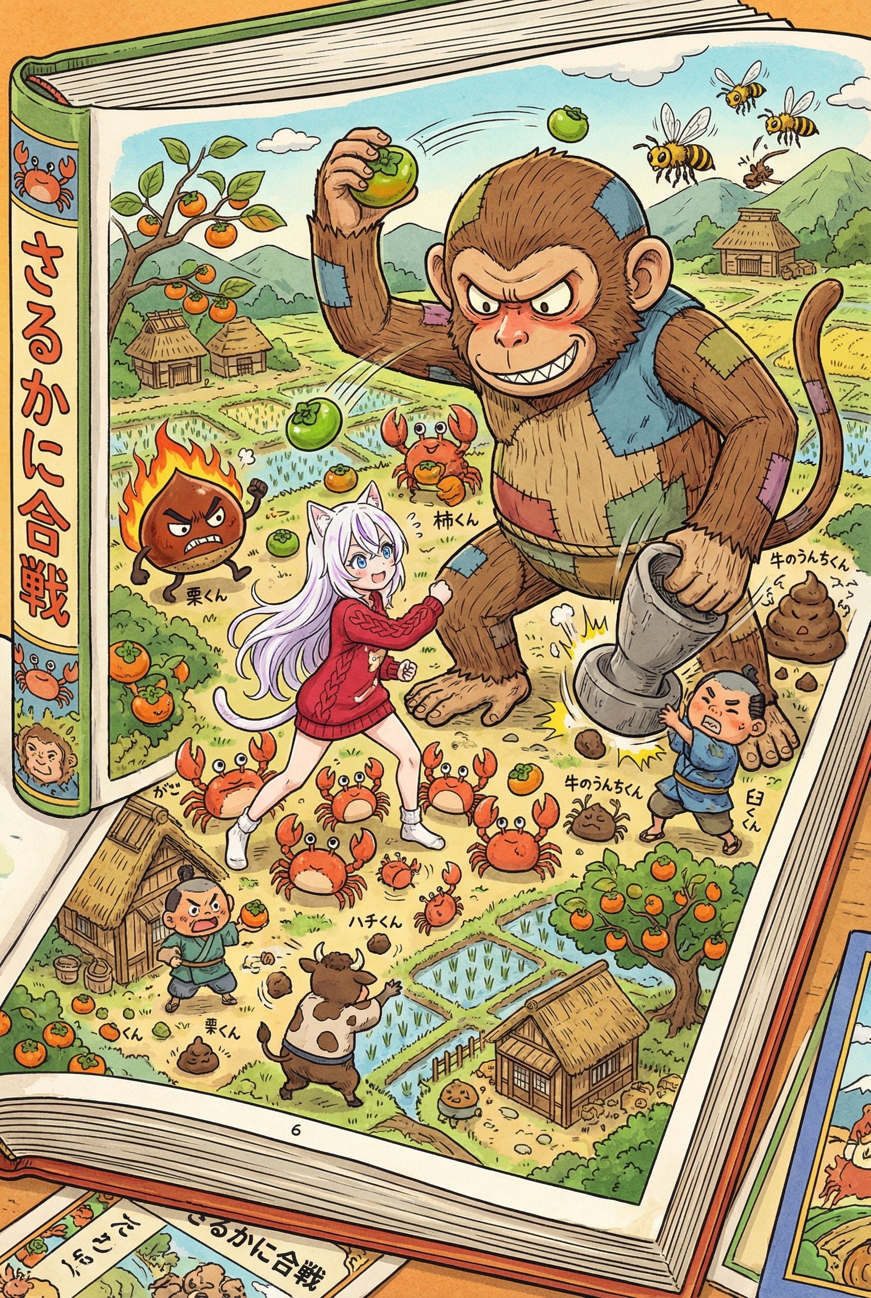 HARPYで描いたノルウェージャン娘のノルちゃんが、絵本「さるかに合戦」の中にはいってしまいました🤣