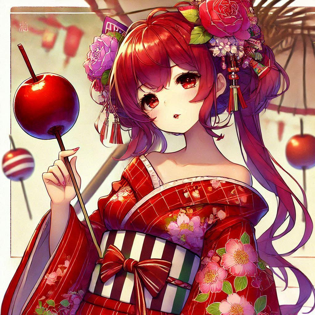 縁日を想定したら芸妓さんが出てきてしまいましたが、図らずも良かったところがあって、りんごはバラ科の植物ということで、髪飾りにバラが使われているのが粋だなと思った次第です
