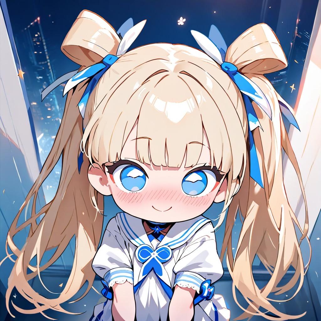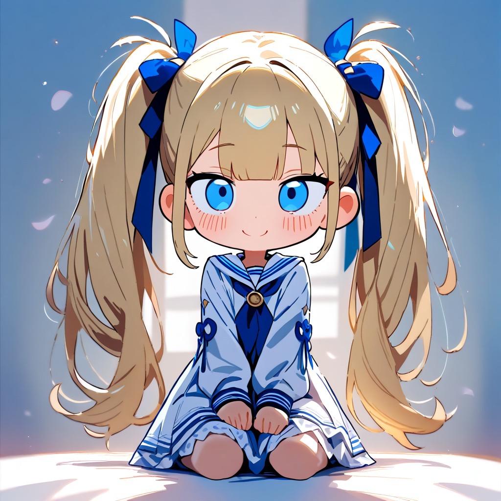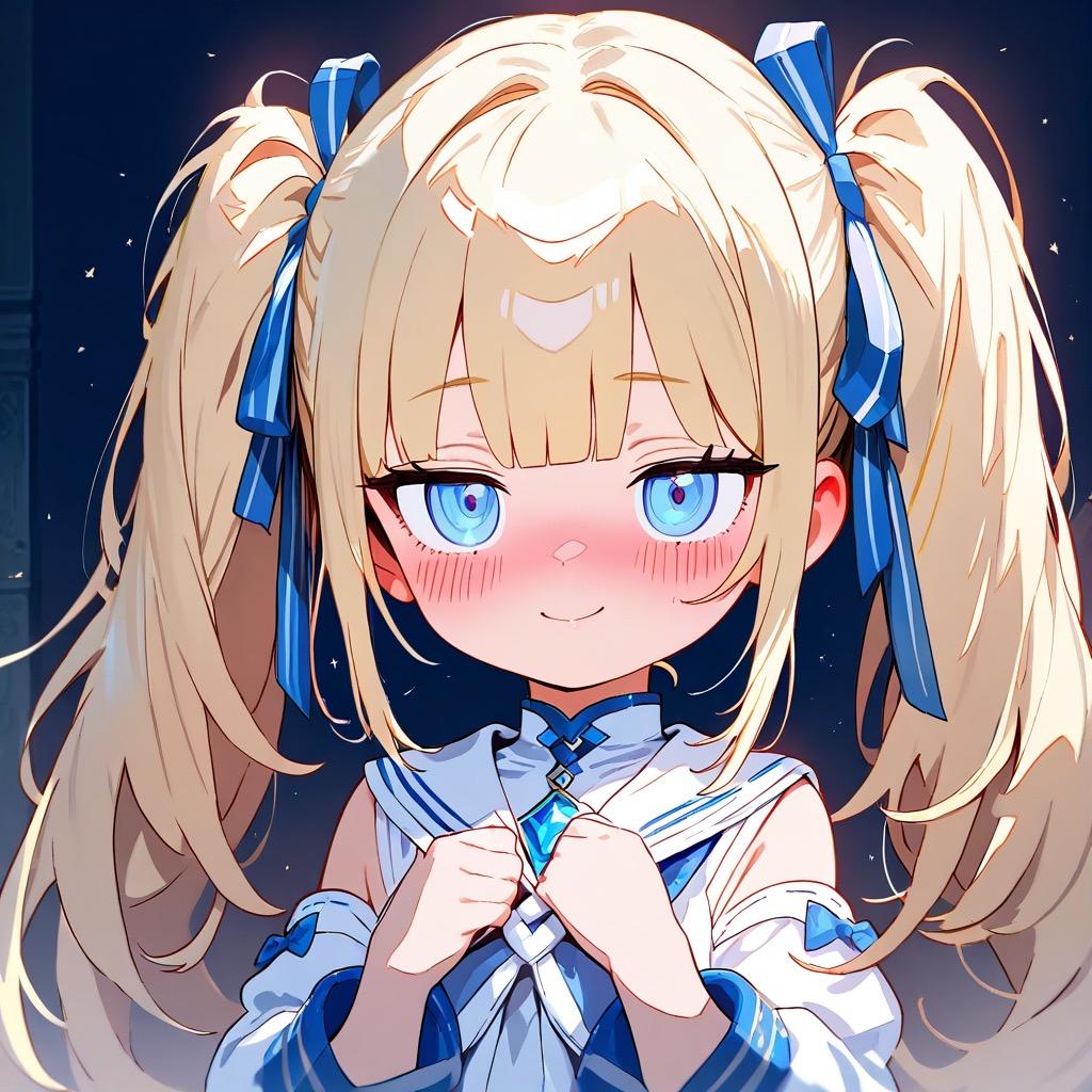 ultra detailed loli,(jitome,big blue eyes,smile),(blunt bangs,blonde hair,twintails hair,hair ribbon),
