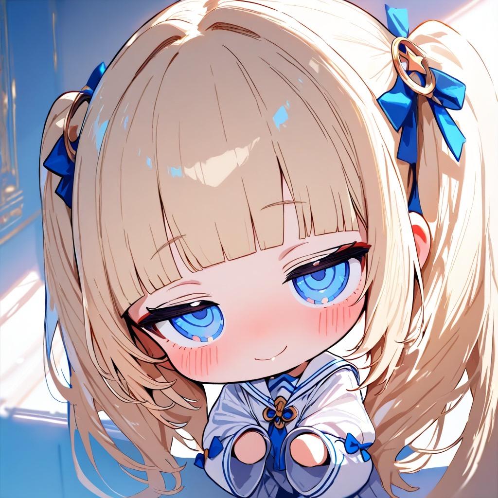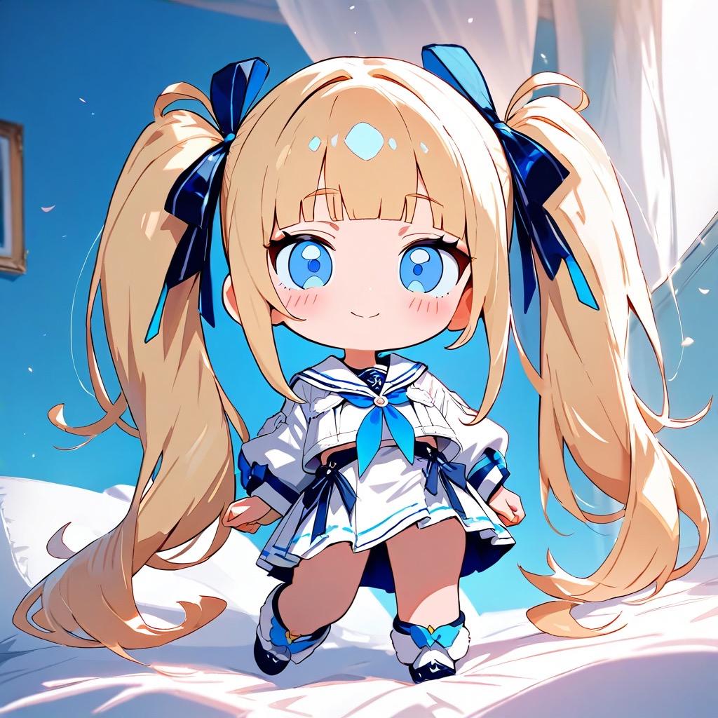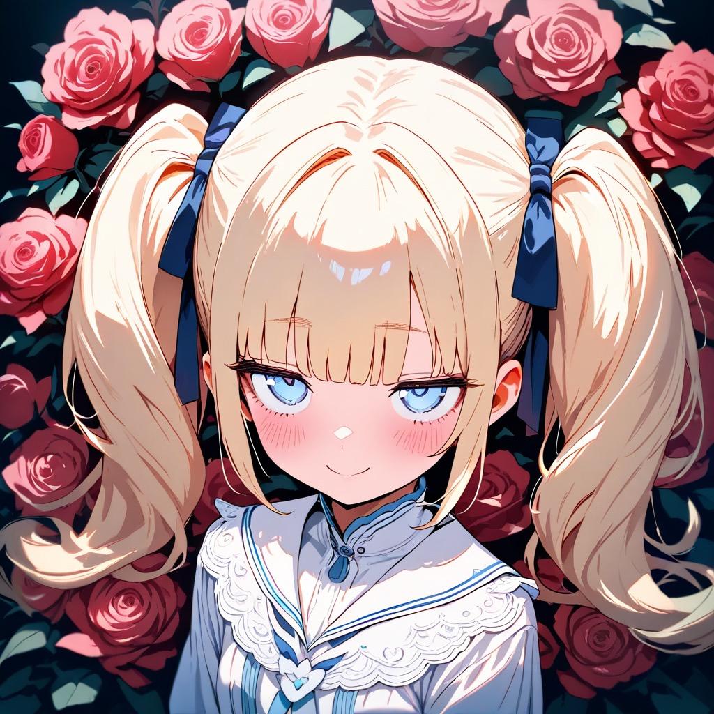 ultra detailed loli,(jitome,big blue eyes,smile),(blunt bangs,blonde hair,twintails hair,hair ribbon),