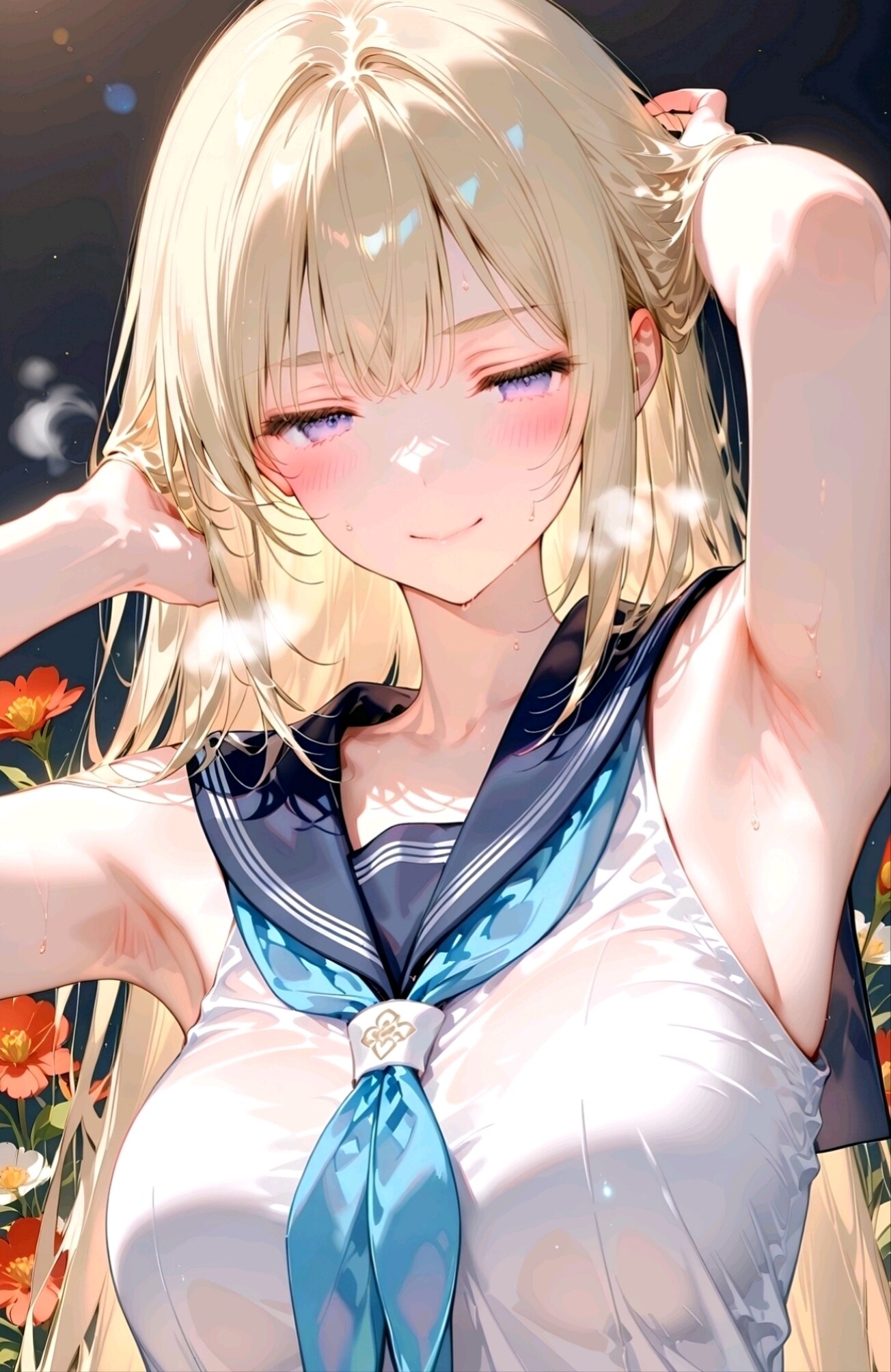 惜し気もなく腋をみせてくれるブロンド女子高校生