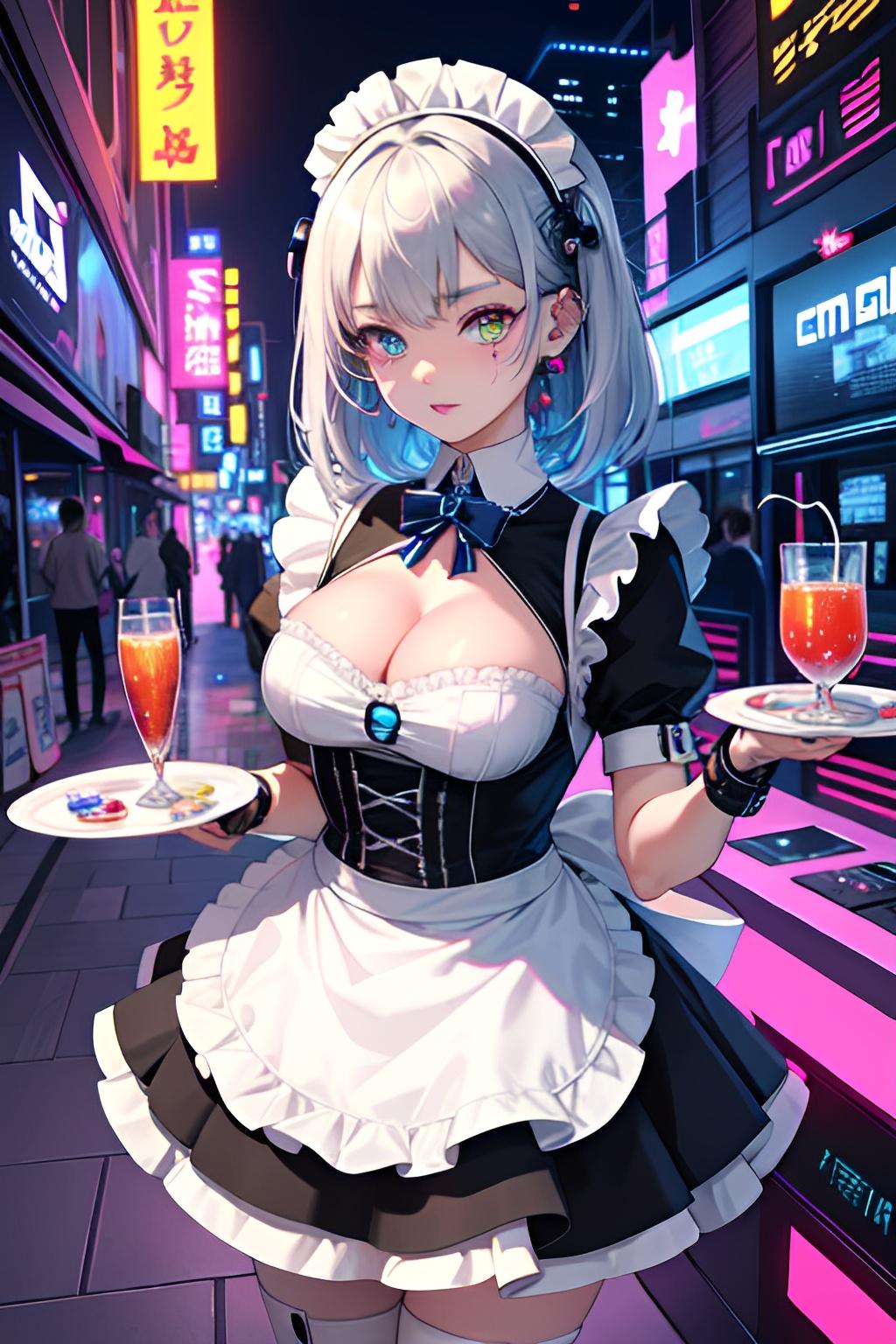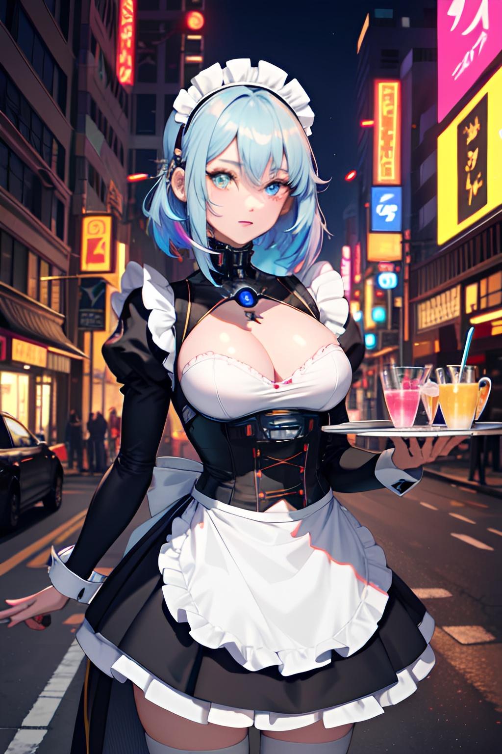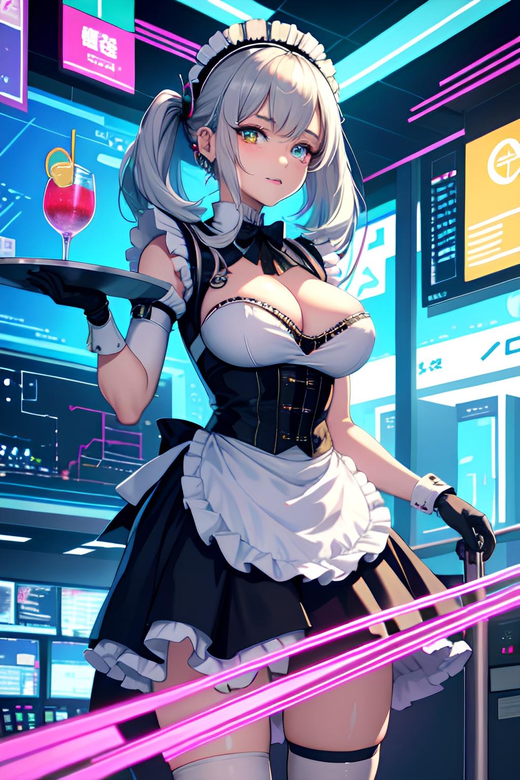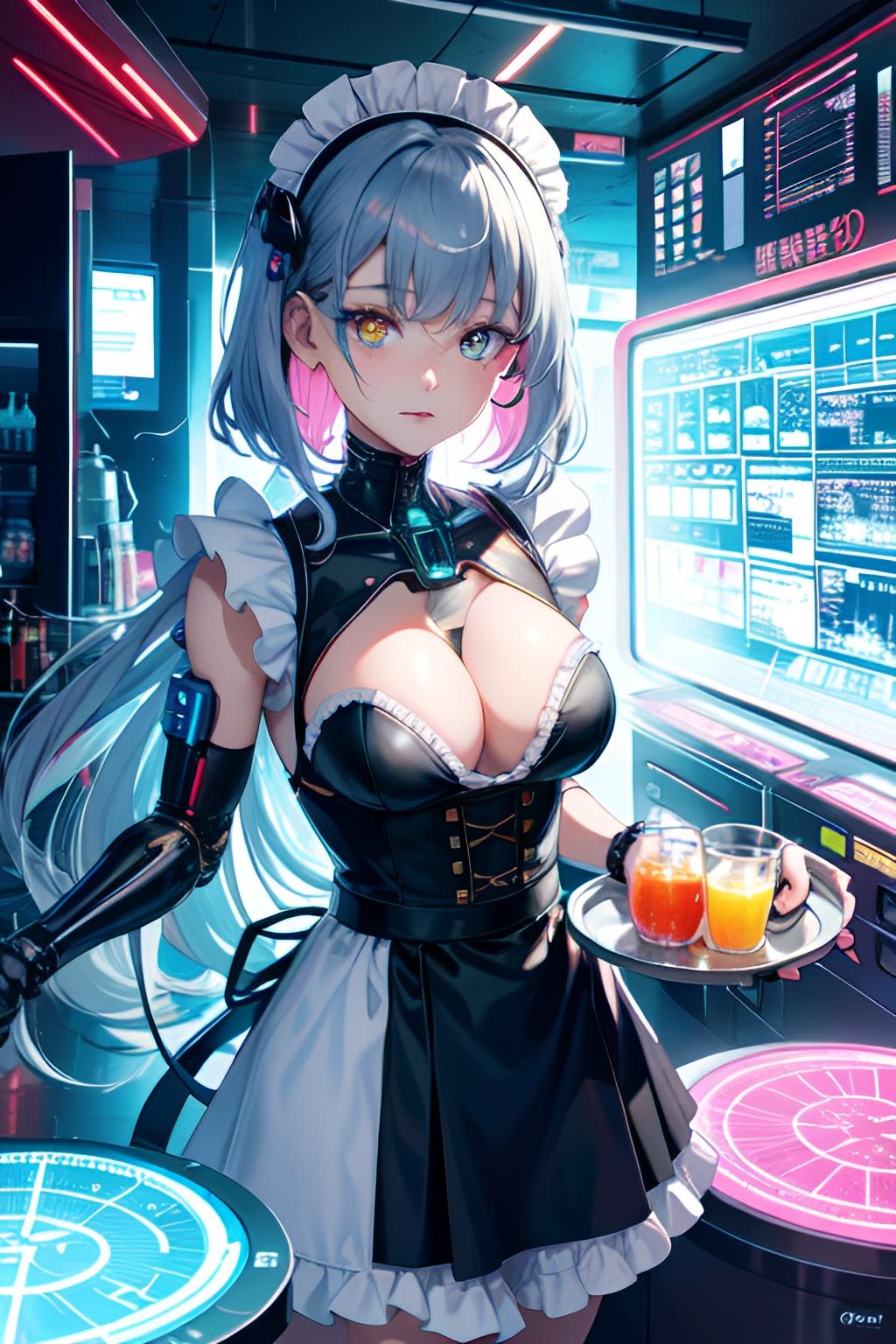 未来のサイバーバーで働くサイボーグメイドを描いたイラストです。彼女はお客様を歓迎し、フレンドリーなサービスを提供します。彼女の独特なスタイルと魅力的な外観で、お客様を楽しませます。是非お楽しみください!