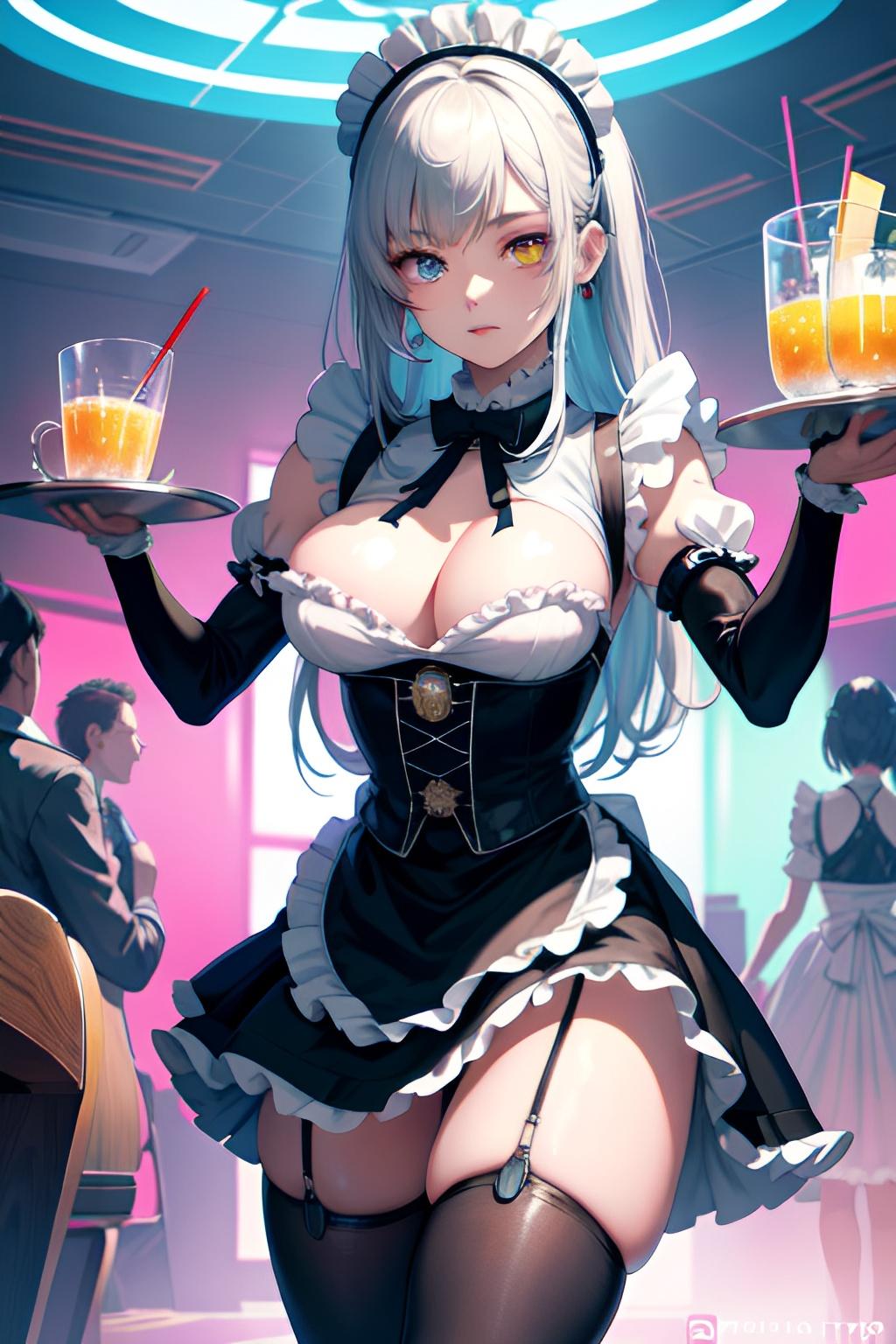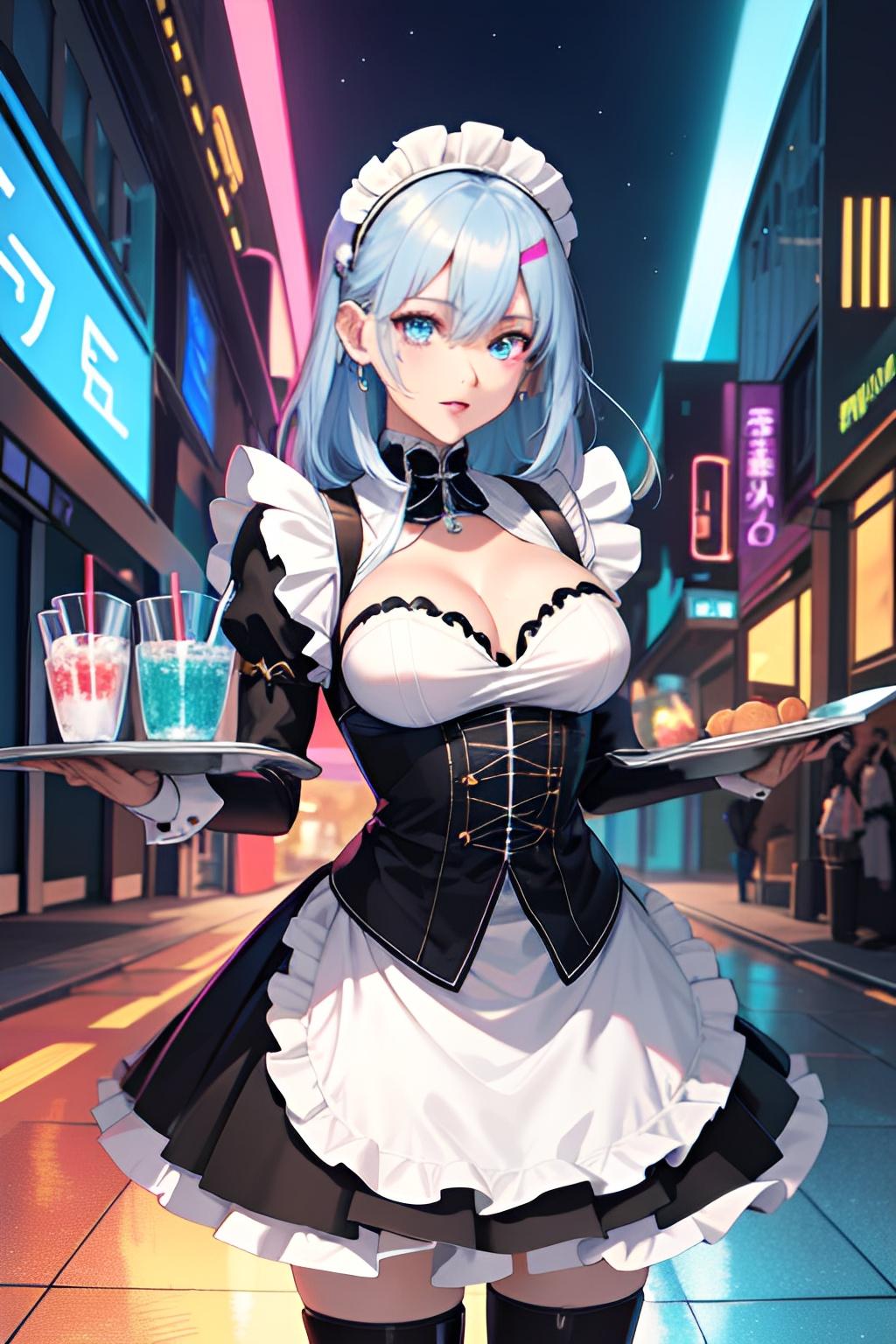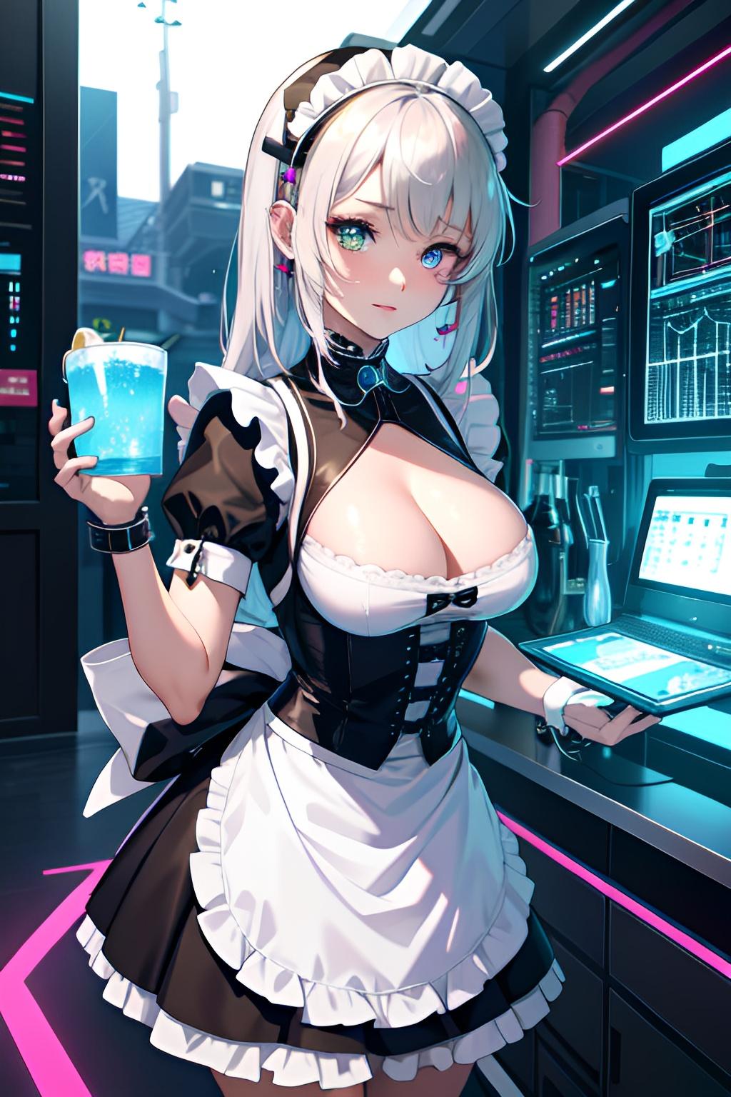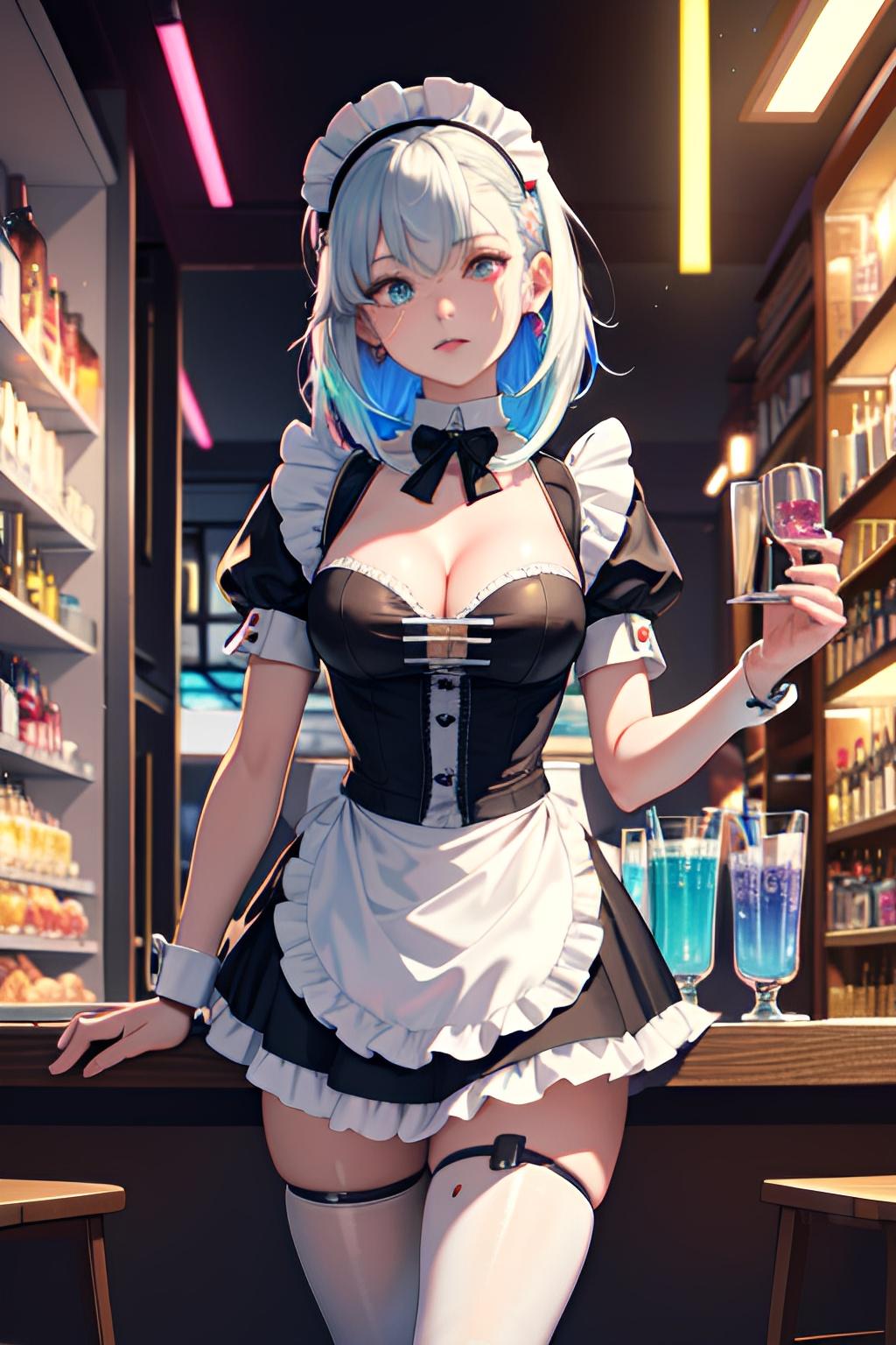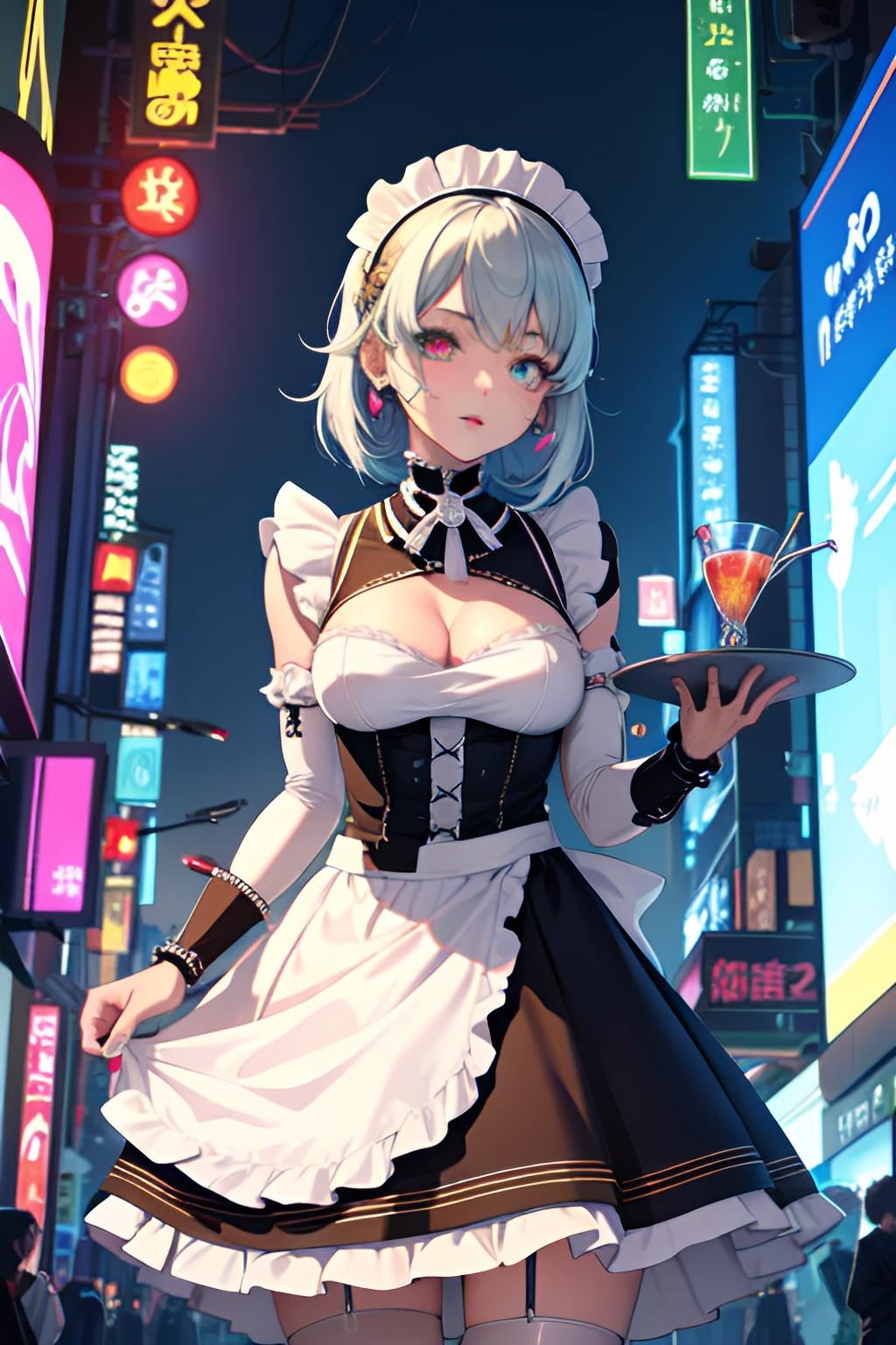 未来のサイバーバーで働くサイボーグメイドを描いたイラストです。彼女はお客様を歓迎し、フレンドリーなサービスを提供します。彼女の独特なスタイルと魅力的な外観で、お客様を楽しませます。是非お楽しみください!
