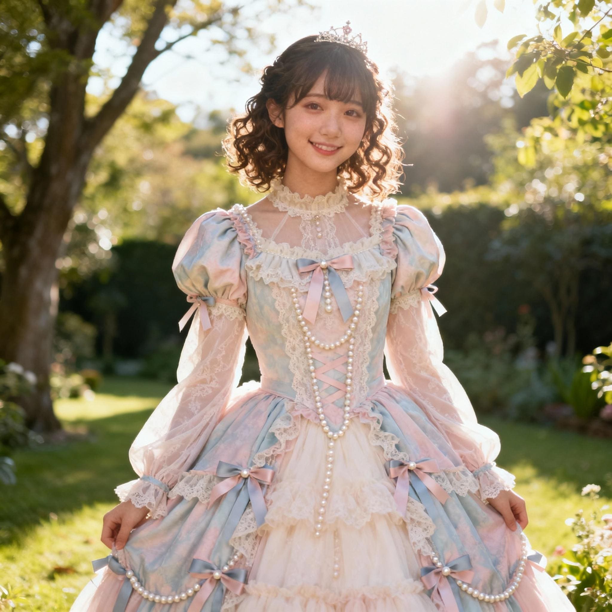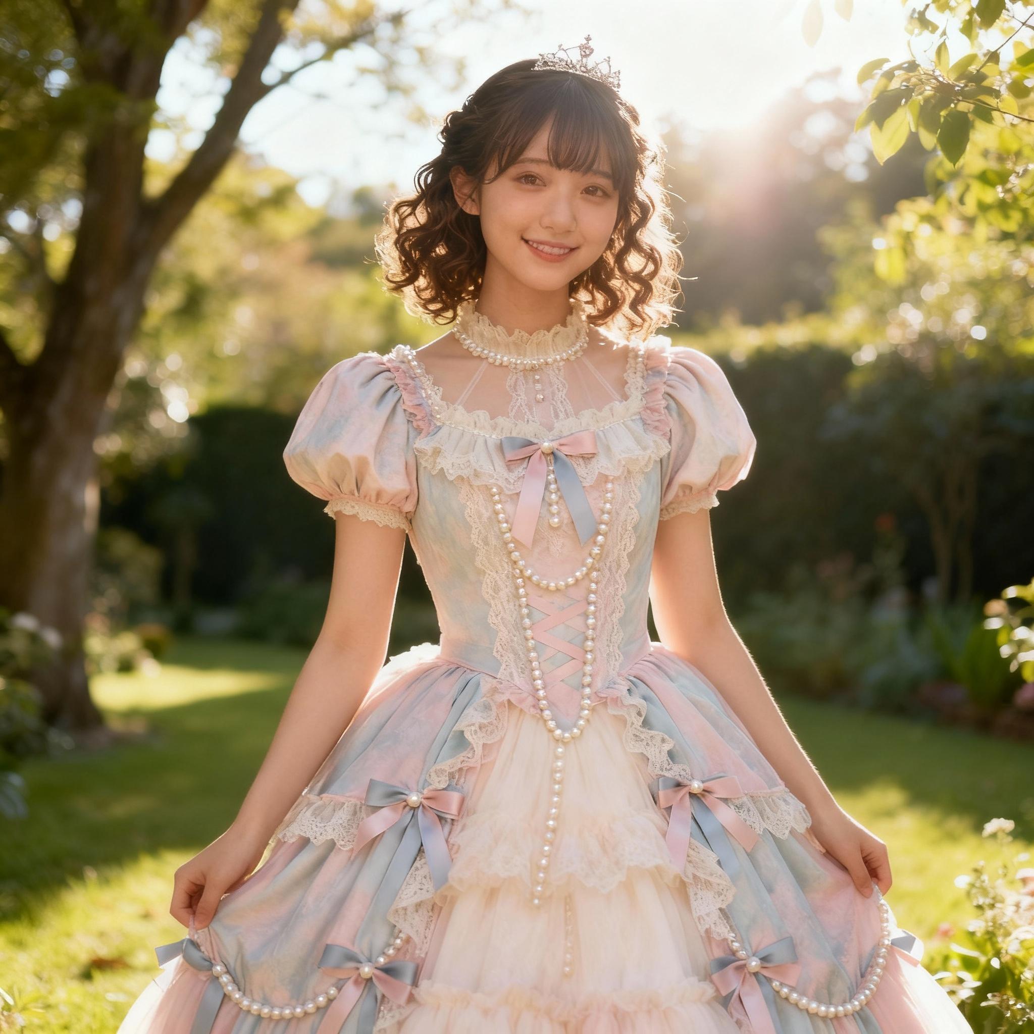 (ドレスをライトブルーのデニムジャケット、白いTシャツ、ハイウエストジーンズに変えてください。ティアラは外してください)