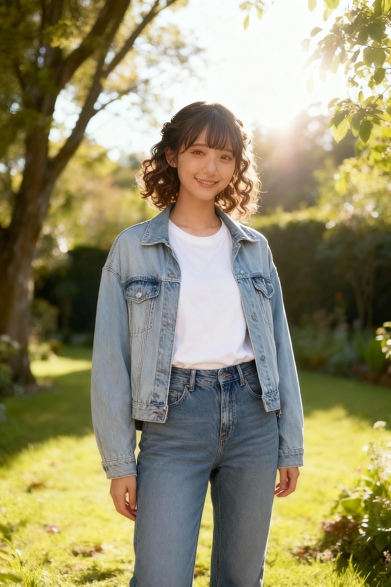 「Change the dress to a light blue denim jacket, a white T-shirt, and high-waisted jeans. Remove the tiara.」