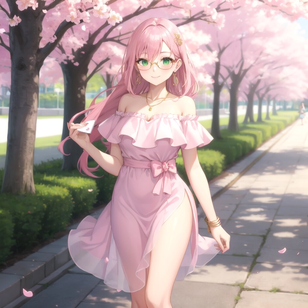 ピンク髪のロングヘアとグリーンの瞳が映える彼女は、春のデートにぴったりのエレガントな装いで登場。オフショルダーの淡いピンクのワンピースが、彼女の女性らしい曲線美を引き立て、軽やかなシフォン素材が春風になびく。ゴールドの華奢な眼鏡をかけ、繊細なゴールドのアクセサリーを合わせた上品なコーディネート。桜が舞う石畳の道で、優雅に眼鏡を直しながら微笑む姿が美しい。