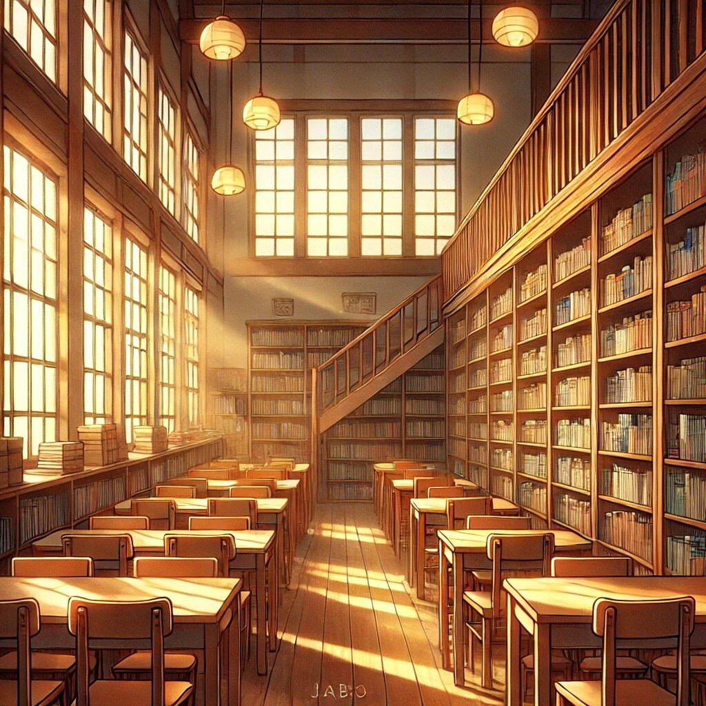 静かな日本の高校の図書室。木製の本棚に整然と並ぶ本、大きな窓から差し込む日差し、勉強用の木製の机と椅子。ノスタルジックで穏やかな雰囲気、柔らかく暖かい光。アニメ風のイラスト。