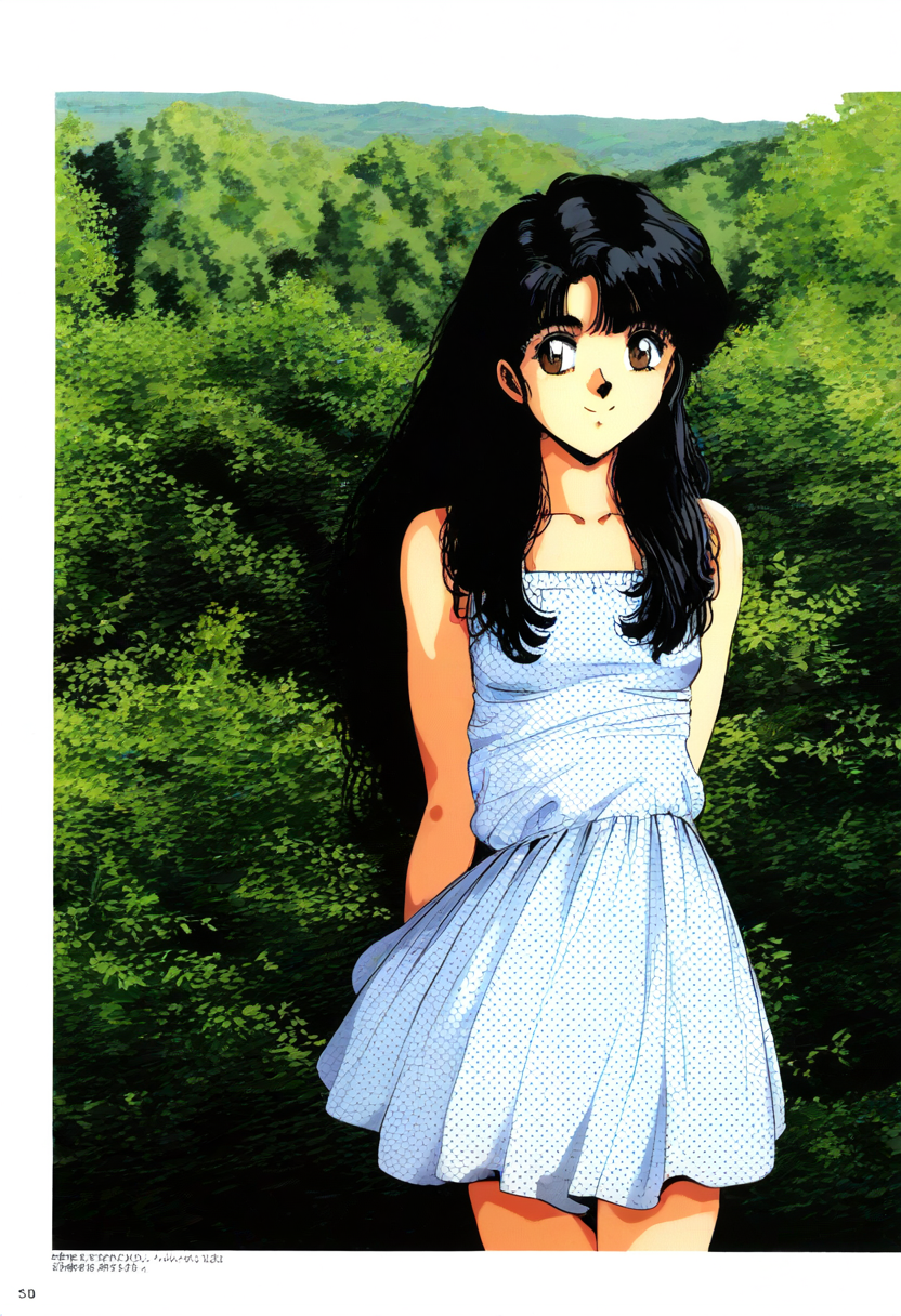 ①retro artstyle, sundress, light blue dress, polka dot dress, fresh skin, facing page, title, outdoors, day, rural area, nature, forest, mountain, blue sky, cloud sky, full screen, animal road,