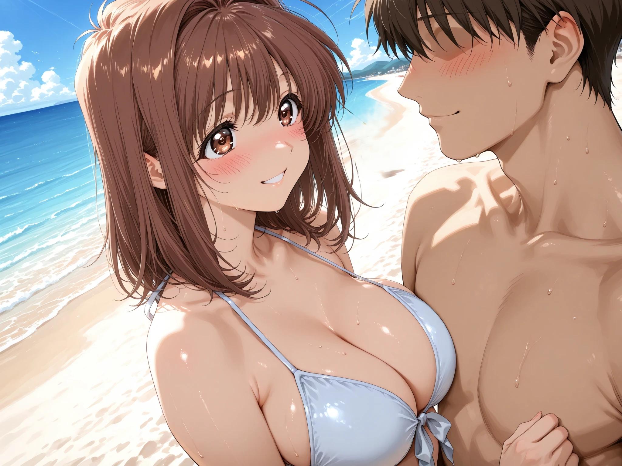 白い砂浜、きらめく海。陽射しに包まれた彼女は、白いビキニを揺らしながら夏の午後を楽しんでいた。