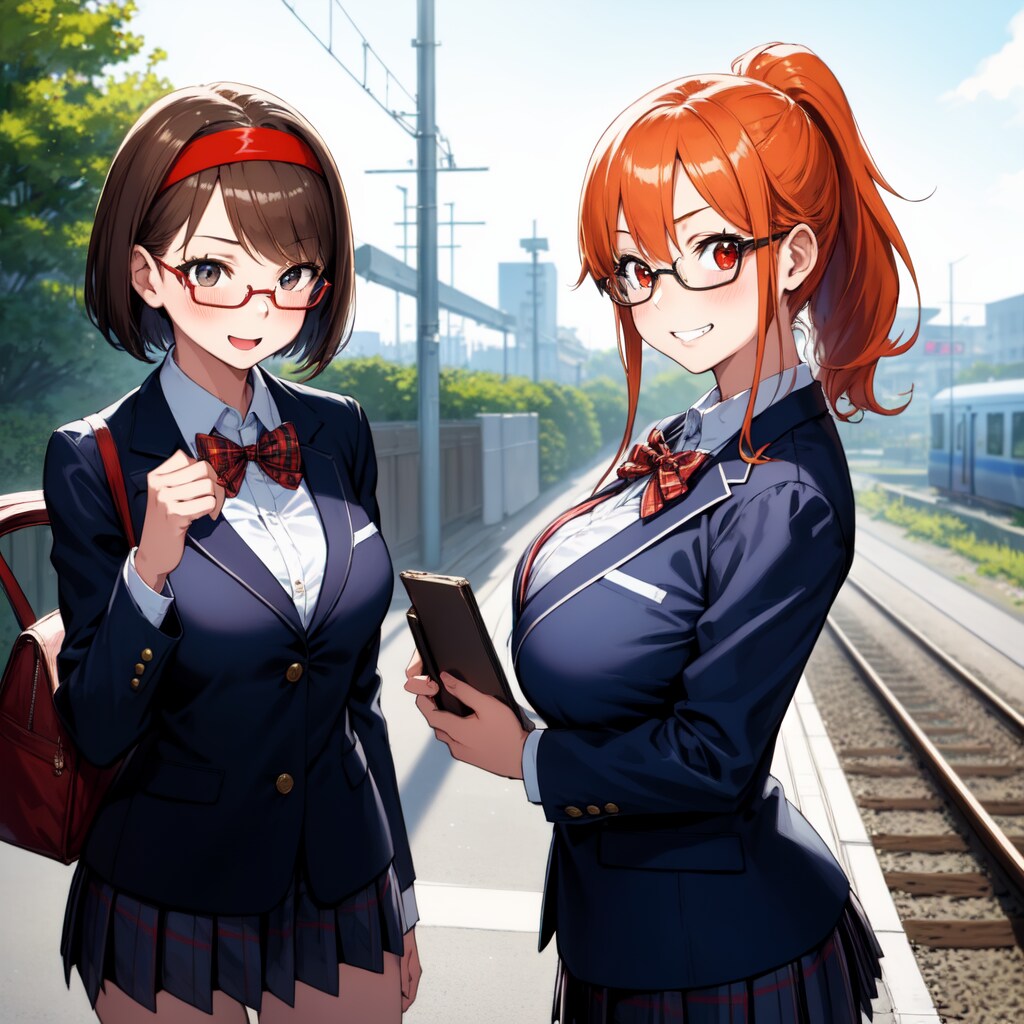 通学路の駅のホームでヘアバンちゃんとポニテちゃんが電車待ってるところ夜遅かったのにケロッとしてる流石運動部体鍛えてるなって。