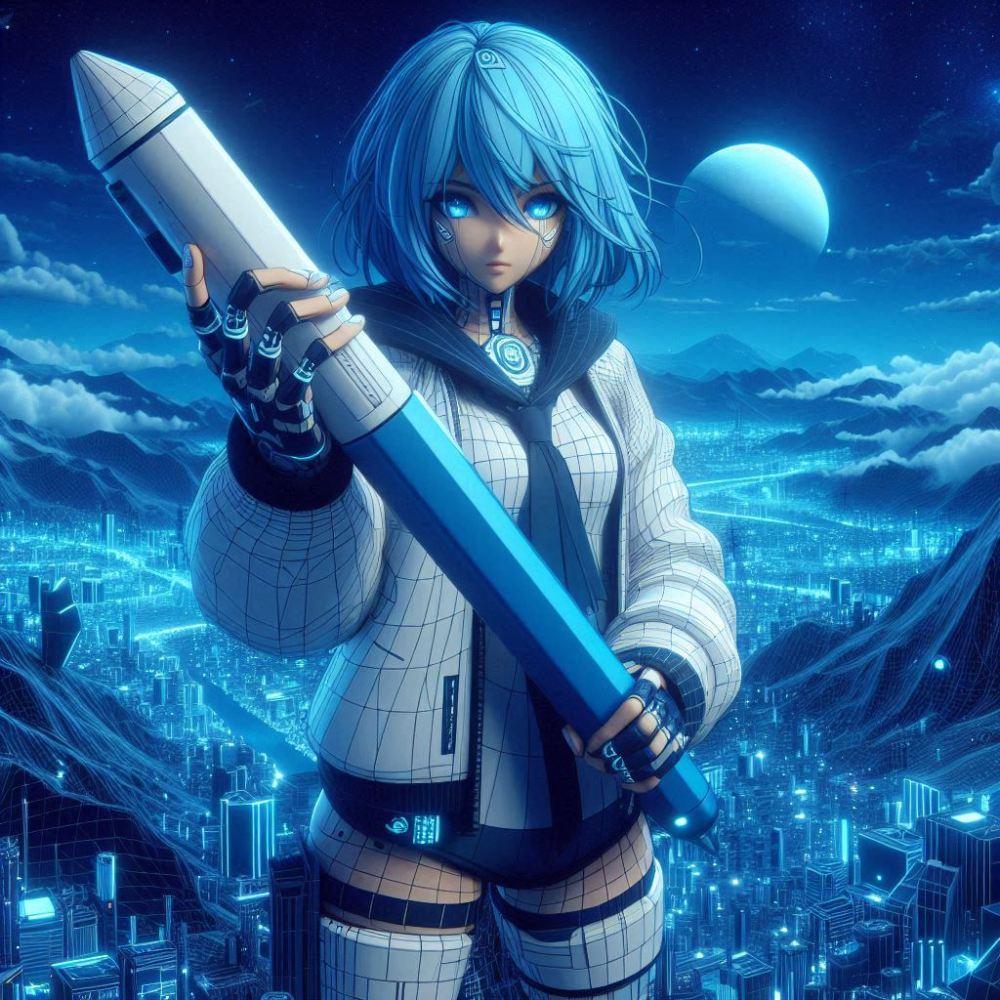 近未来SFサイバーパンク、ワイヤーフレーム3DCGアニメイラスト、ピクシブたん